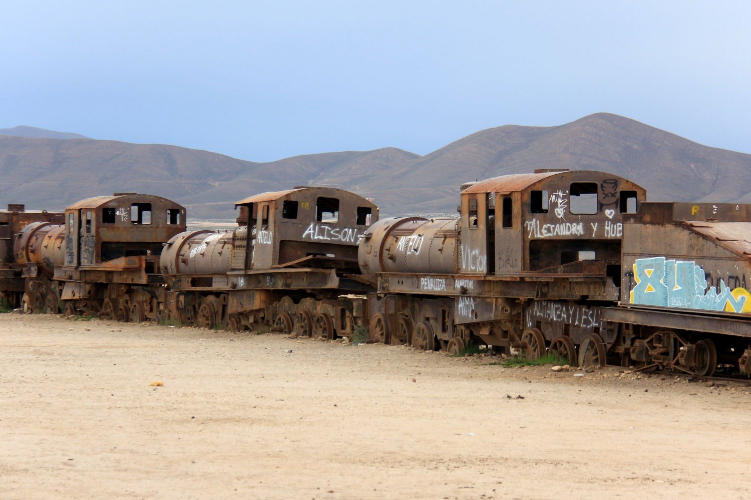 Locomotivas enfileiradas no Cemitério de trens de Uyuni.