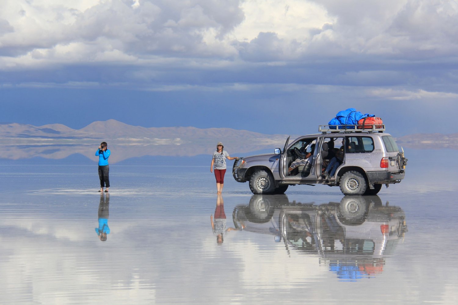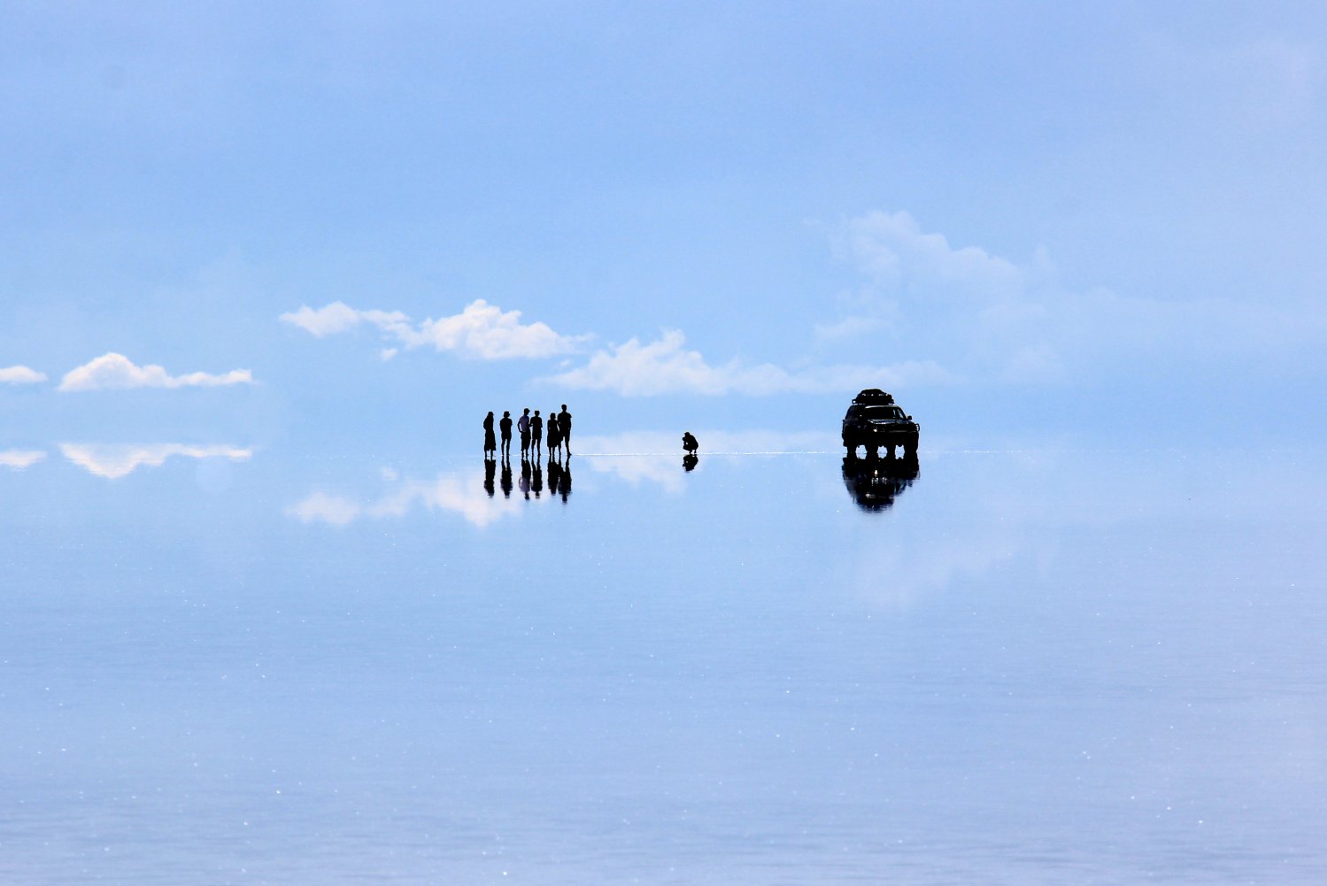 De lá caminhamos até a praça das bandeiras e depois almoçamos no interior do antigo hotel de sal Playa Blanca, atualmente desativado. Até então, aquele mundaréu de turistas e veículos causou certa decepção, contrariando a expectativa de um passeio por áreas remotas do Salar, longe de tudo e de todos. Com a lâmina d’água decorrente das chuvas no período de dezembro a março, o deslocamento pelo Salar fica um tanto limitado, concentrando os grupos em uma mesma região. Alguns atrativos como a ilha Incahuasi, com os seus cactos gigantes, fica inacessível nesta época do ano. Por outro lado, o reflexo do céu na lâmina d’água produz um efeito surreal e indescritível.