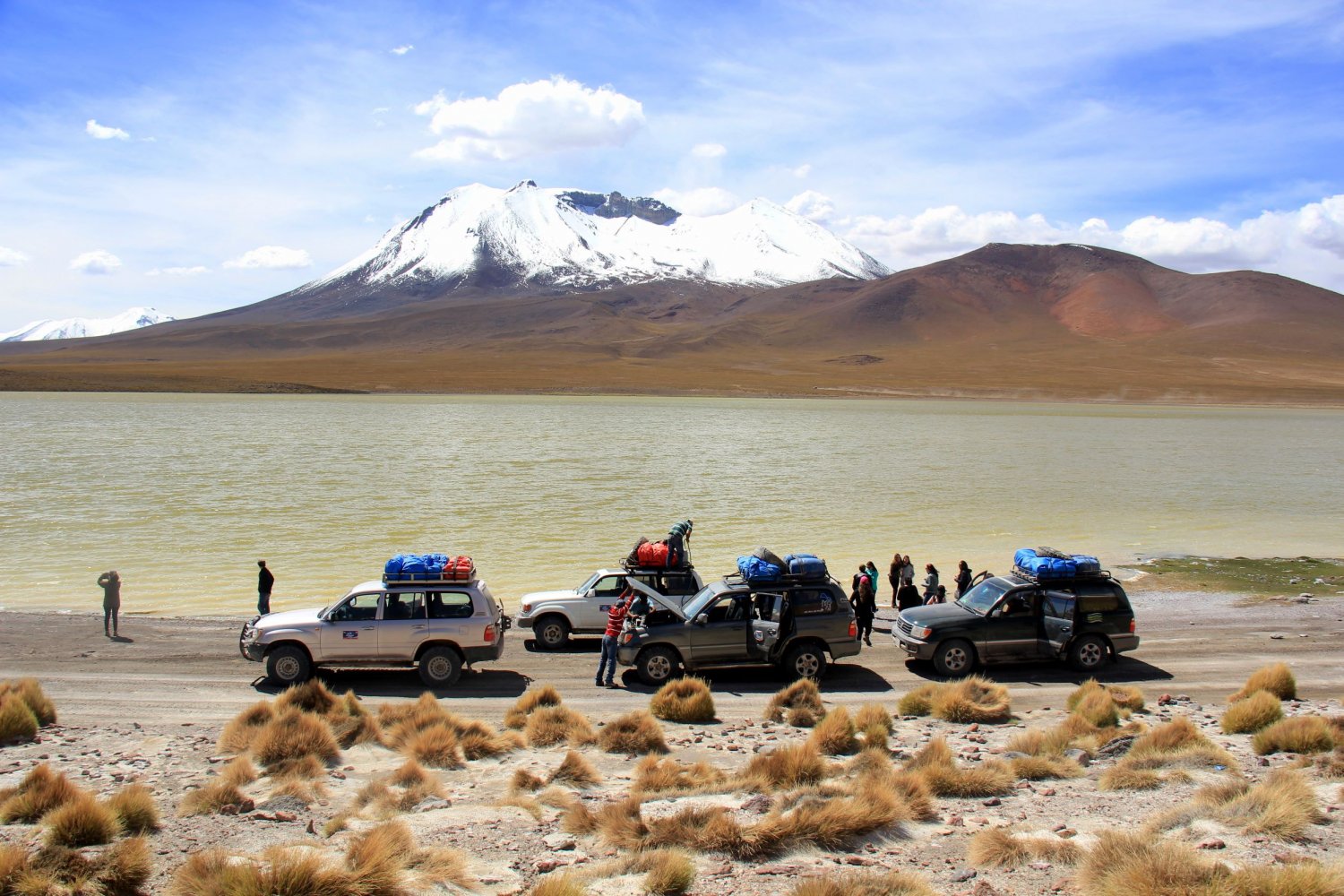 Turma se aquecendo ao sol no Deserto de Dali. O cume nevado ao fundo é do cerro Amarillo (5.661m).