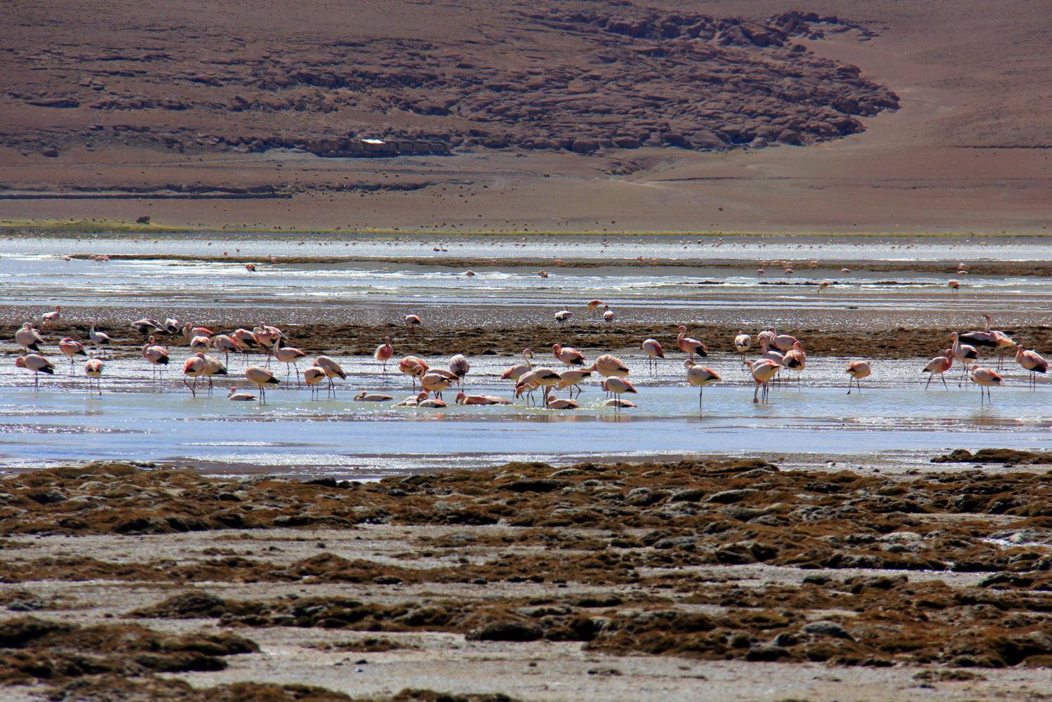 Após o almoço, rumamos sentido Sul, com mais uma parada para observar os cumes nevados a nossa volta, dentre eles os cerros Chuhulla (5.431m), Caquella (5.965m) e Chulluncani (5.486m). Às 16h chegamos na Laguna Chulluncani, na base do pico de mesmo nome, onde permanecemos por um tempo apreciando a vista e tirando fotos. Um pouco mais à frente paramos em uma planície de inundação, repleta de flamingos. Permanecemos por lá por cerca de meia hora contemplando as belas paisagens do entorno, além de fotografar um casal de alfaiates-andinos (Recurvirostra andina), ave aquática típica dos Andes, que nadava tranquilamente em uma pequena lagoa.