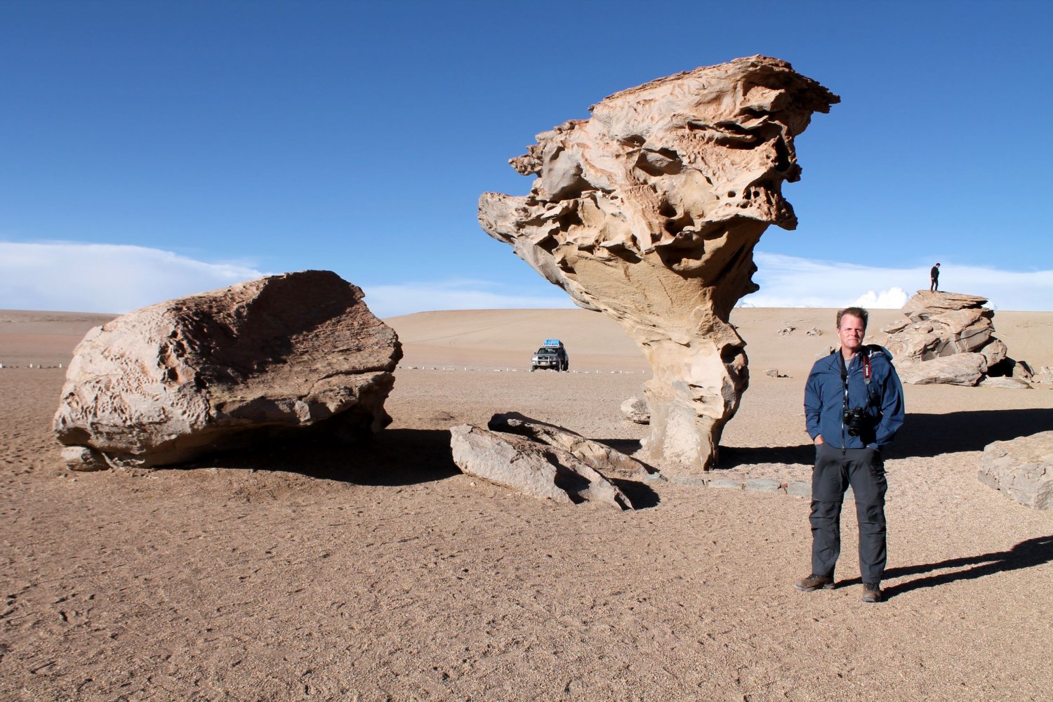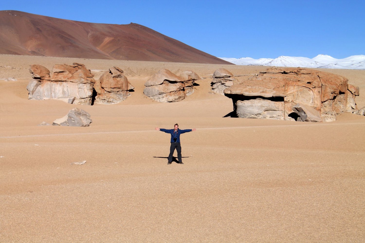 Fizemos mais uma parada rápida na Laguna Q’ara para fotografar flamingos e seguimos pelo deserto de Siloli, rumo à Árbol de Piedra, famosa escultura rupestre da região. O deserto Siloli, situado a sudoeste do departamento de Potosí, na Bolívia, é caracterizado pelas formações rochosas erodidas pelos fortes ventos que sopram na região. É considerado como um dos mais áridos do mundo, além de porta de entrada para a Reserva Nacional de Fauna Andina Eduardo Avaroa. Tiramos a tradicional foto ao lado da escultura e fomos caminhar em meio às formações rupestres espalhadas pelo deserto. Os tons e o contraste das cores na paisagem pareciam ter sido editados com Photoshop!