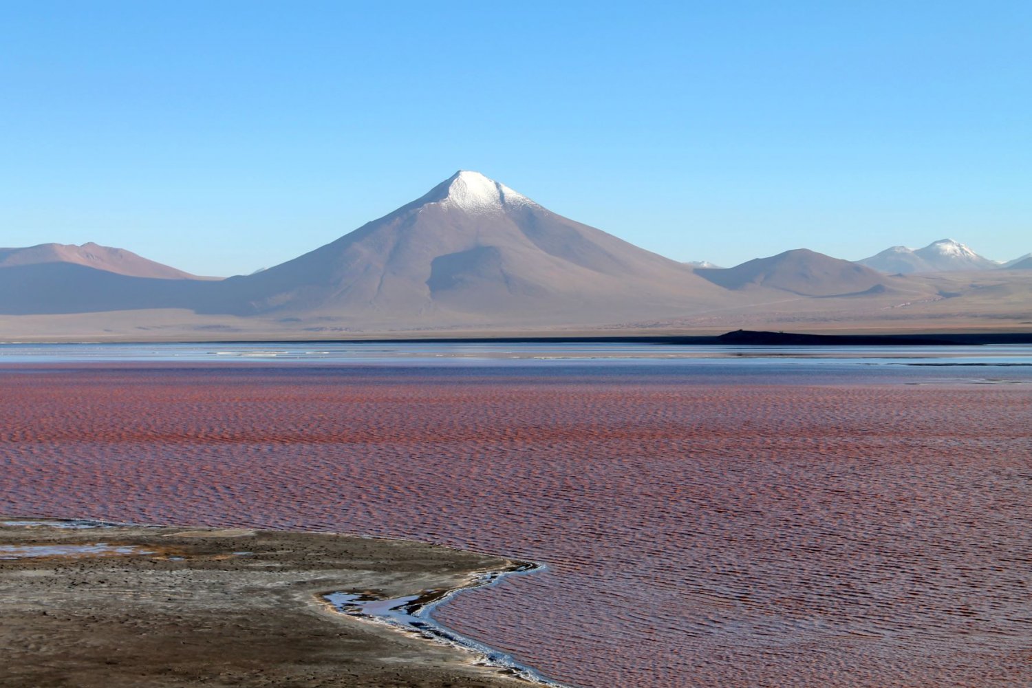 Laguna Colorada com a sua cor característica. Ao fundo o cerro Pabellón (5.490m).