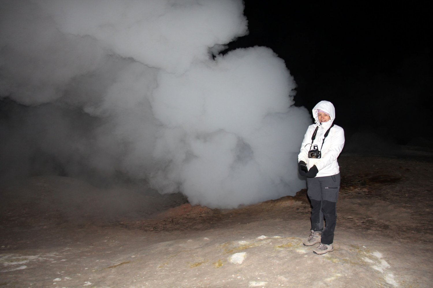 Antes do amanhecer é o melhor horário para ver os jatos de vapor, motivo pelo qual toda a área fica tomada por turistas que disputam os melhores pontos para fotografias. Caminhamos pelo local em meio ao frio e ao escuro, inicialmente passando pelas fumarolas de vapor e depois pelos tanques de lama branca borbulhante. Assim que começou a amanhecer e o local foi se tornando visível, tivemos que seguir nossa viagem. Uma pena. Queria ter permanecido mais um tempo por lá para acompanhar com a luz do dia este interessante fenômeno geotérmico.