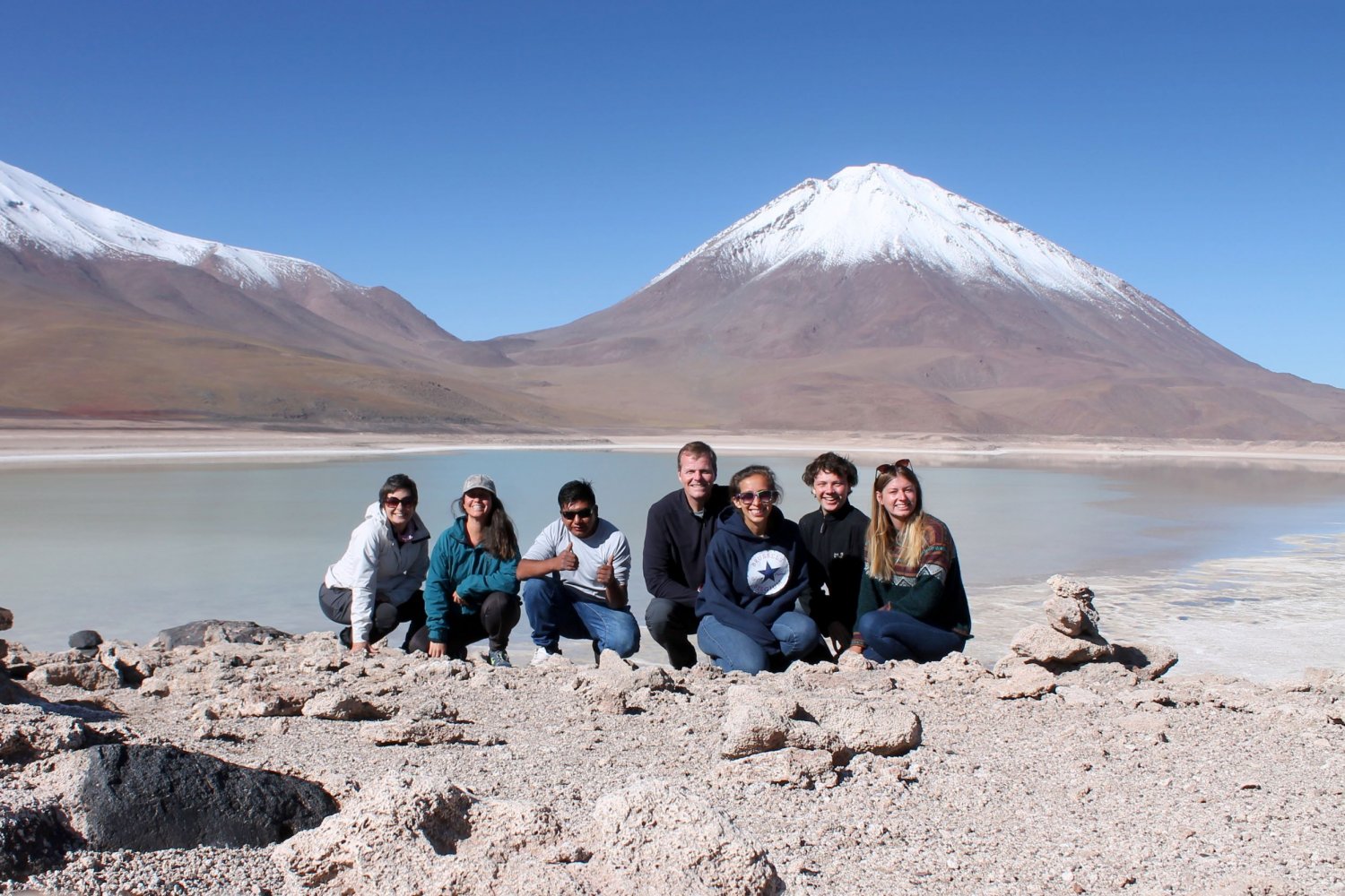 Última foto com a turma antes da despedida, às margens da Laguna Verde, com o vulcão Licancabur ao fundo. Da esquerda para a direita: Giselle, Tania, Michael, André, Alexandra, Linus e Lena.