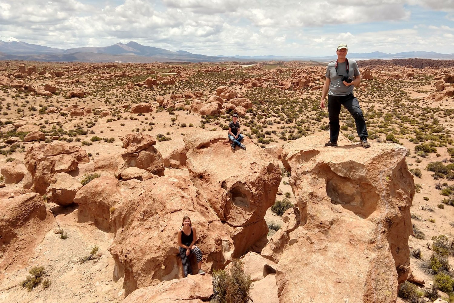 Às 12h paramos na região conhecida como Valle de las Rocas, com belas e curiosas formações rochosas em meio ao deserto, cercado de cumes nevados de vulcões. Retomamos a estrada até um dos braços da Laguna Turquiri, onde paramos para o almoço. Aproveitamos para explorar um pouco o local, subindo um morro próximo com uma bela vista da região.