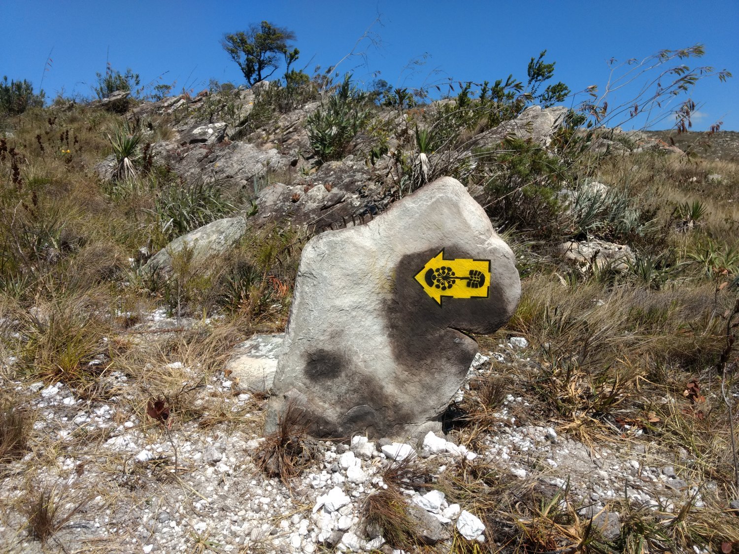 Saída da Casa de Tábuas rumo à Casa dos Currais. No início a trilha segue por colinas cobertas por gramíneas. A sinalização (pegada dentro da seta) é o padrão adotado pela trilha de longo curso Transespinhaço, da qual o traçado da travessia faz parte. Seta amarela com pegada preta indica o rumo Sul. Seta preta com pegada amarela indica o rumo Norte.