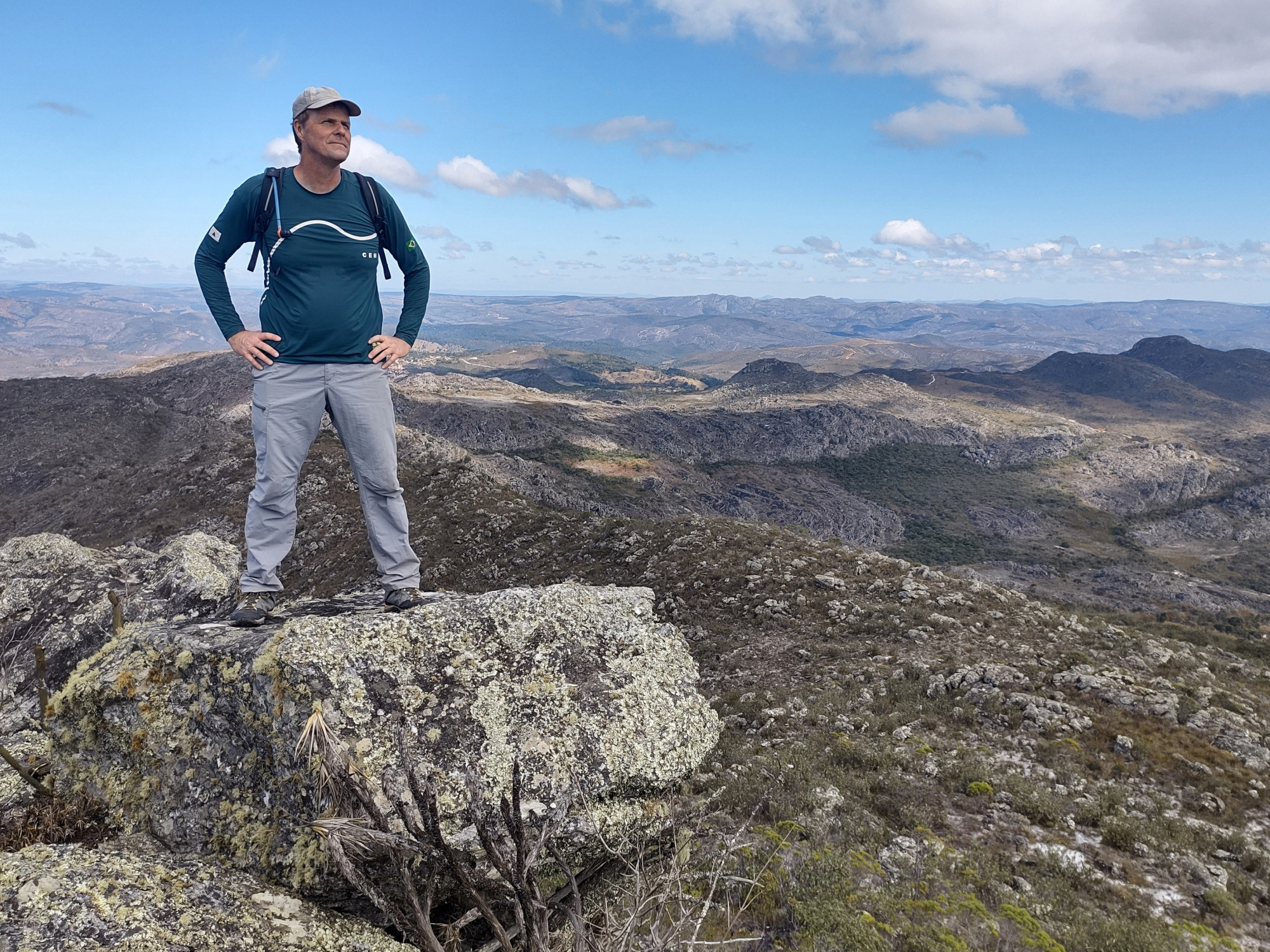 Iniciamos a caminhada pela região do Lajeado, planície que abriga as drenagens do córrego homônimo, subindo em seguida a Serra do Ouro, onde fizemos uma rápida parada na lapa do Garimpeiro e nas pinturas rupestres ao lado. Depois, seguimos até o cume do pico do Raio (1.409m), elevação que se destaca na paisagem e de onde se tem uma vista privilegiada de toda a região, especialmente dos distritos de Milho Verde, São Gonçalo do Rio das Pedras e Capivari, este com o imponente pico do Itambé (2.052m) ao fundo. Apesar de algumas subidas mais íngremes, a caminhada foi relativamente fácil, em meio a belos campos rupestres e com a trilha toda sinalizada.