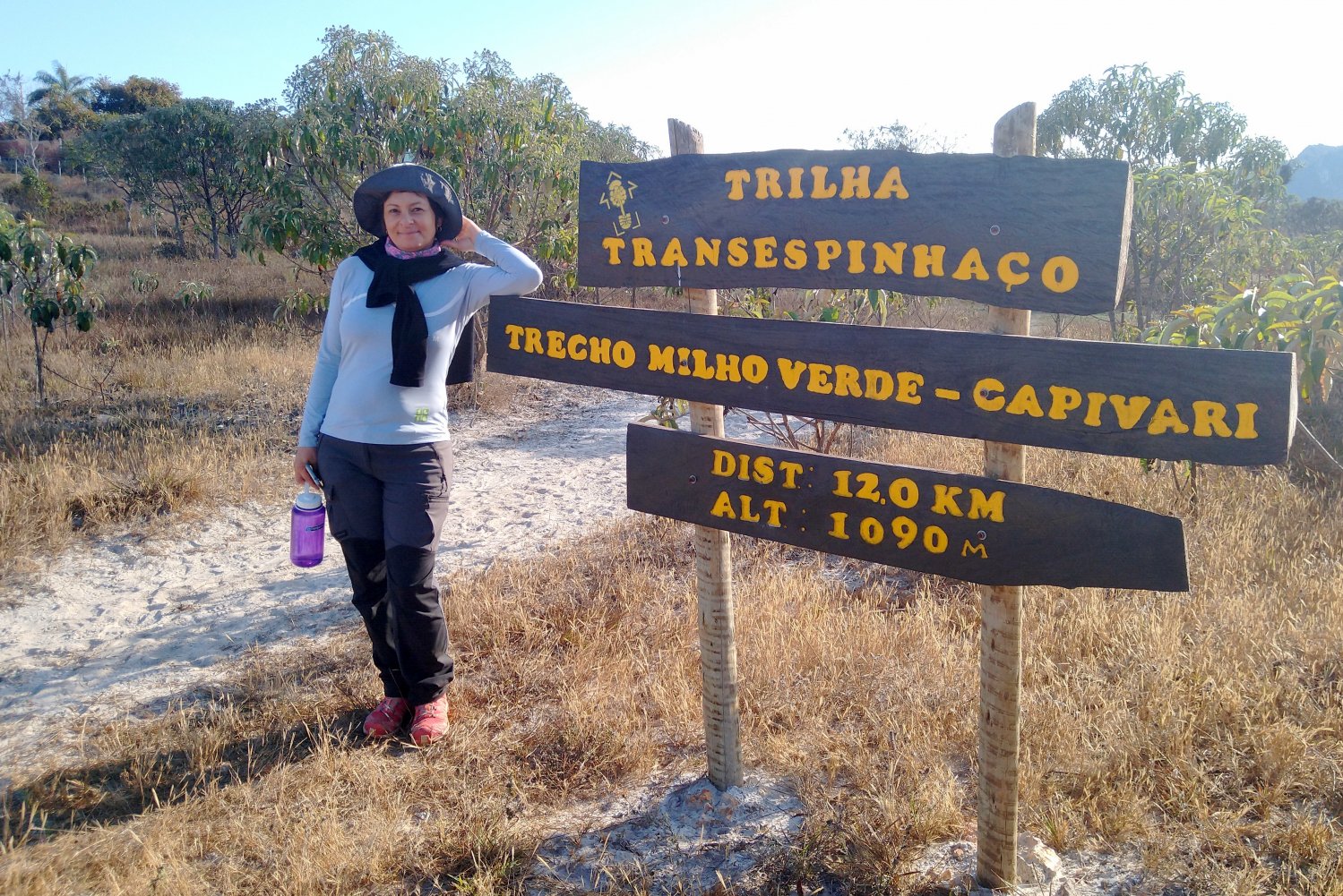 Giselle no início da muito bem sinalizada "Trilha Milho Verde - Capivari".