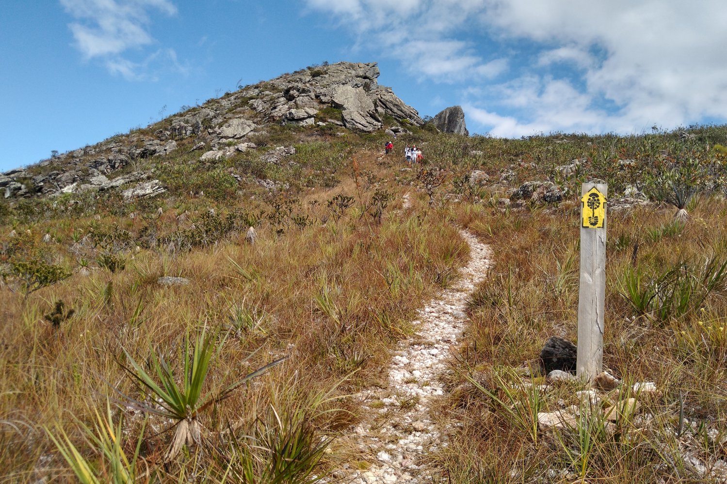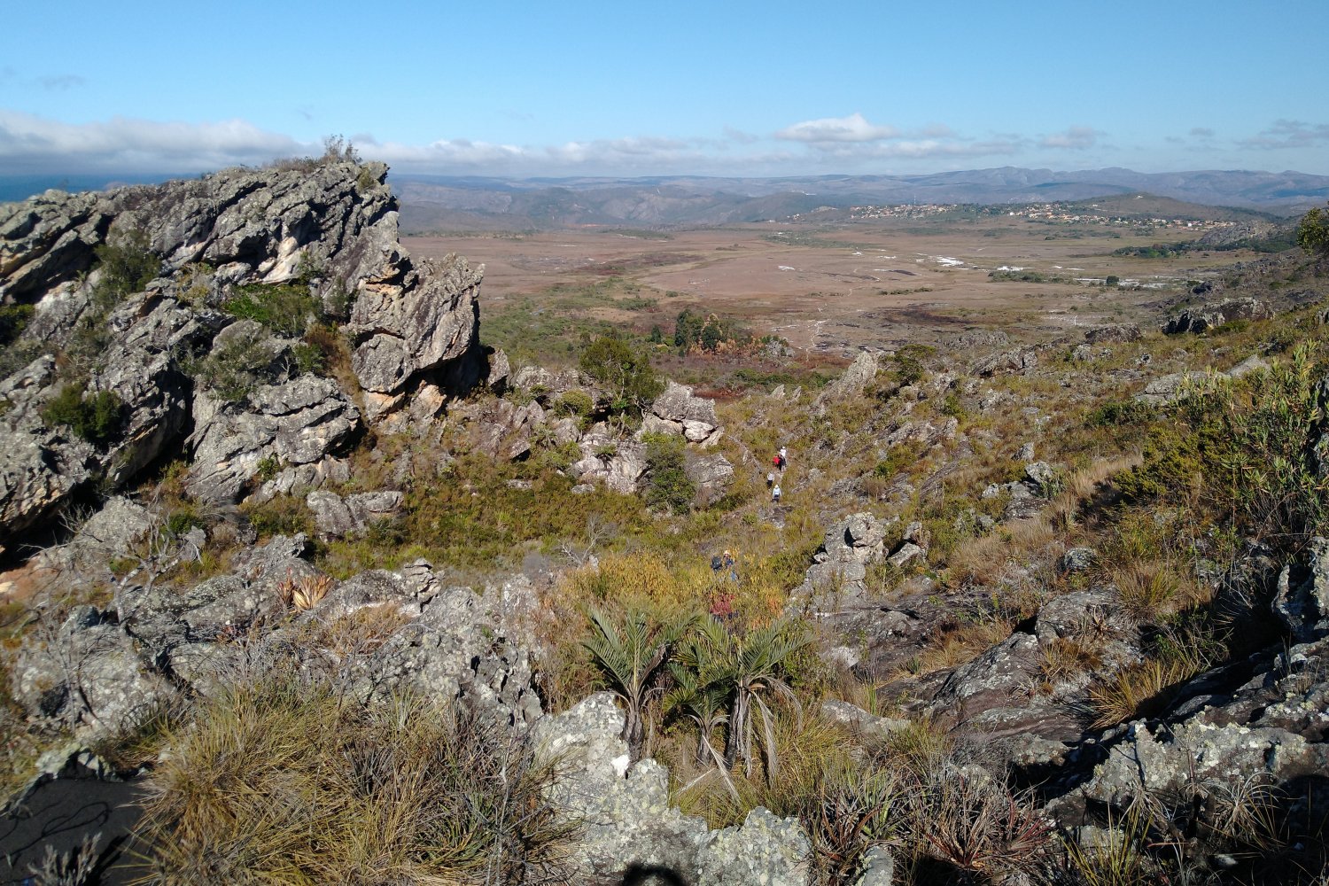 Iniciamos a caminhada pela região do Lajeado, planície que abriga as drenagens do córrego homônimo, subindo em seguida a Serra do Ouro, onde fizemos uma rápida parada na lapa do Garimpeiro e nas pinturas rupestres ao lado. Depois, seguimos até o cume do pico do Raio (1.409m), elevação que se destaca na paisagem e de onde se tem uma vista privilegiada de toda a região, especialmente dos distritos de Milho Verde, São Gonçalo do Rio das Pedras e Capivari, este com o imponente pico do Itambé (2.052m) ao fundo. Apesar de algumas subidas mais íngremes, a caminhada foi relativamente fácil, em meio a belos campos rupestres e com a trilha toda sinalizada.
