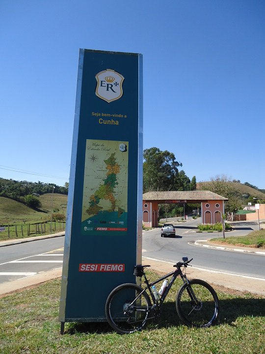 Não demorou muito para ver a sinalização da Estrada Real, mais a frente ao passar pelo primeiro trevo de entrada em Cunha, parei em um posto que tinha uma lanchonete, lá encontrei dois ciclistas, André Machado e Hernando Henrique, ambos de Diamantina, eles estavam terminando sua viagem pela Estrada Real, ficamos conversando um pouco e logo eles seguiram viagem, aproveitei para comer um lanche e reabastecer de água.