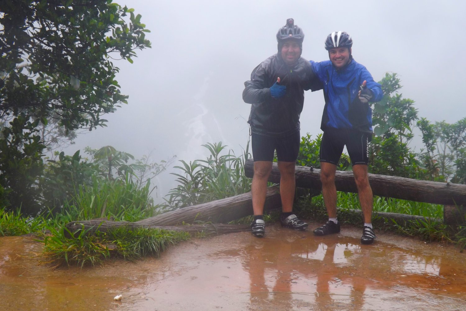 O volume de agua descendo as encostas era muito grande, as pequenas corredeiras das encostas se transformaram em grandes enxurradas, ao chegar no mirante eu ainda brinquei com o Xikaum perguntando se ele ainda queria passar em algum posto para lavar a bike…rs