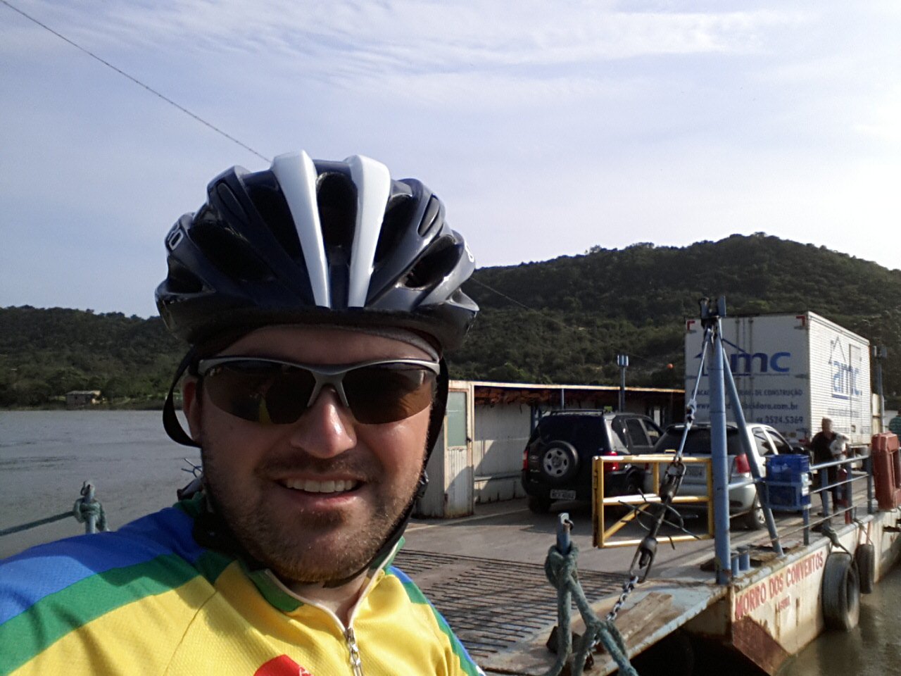 Deixei o Xikaum e segui para a saída de Criciúma que nesse ponto é estressante como qualquer cidade grande, pedalei cerca de 12km para chegar até a BR-101 em uma pista com transito intenso devido o acesso a estrada, já na BR-101 resolvi seguir o conselho que recebi na loja no centro de Criciúma e mudei meu roteiro, desisti de seguir direto para Balneário Gaivota e resolvi passar por Morro dos Conventos fazendo o caminho pelo Rincão, então peguei a BR-101 sentido norte e andei alguns quilômetros até a entrada para o Rincão, peguei uma estrada muito tranquila, que passa por uma paisagem que é um misto de interior e litoral, ainda não tinha tomado um caldo de cana nessa viagem, foi quando avistei uma lanchonete a beira da estrada chamada Caldo de Cana Cardoso, resolvi parar descansar um pouco e tomar um caldo de cana, conversei com os donos muito simpáticos, expliquei a viagem, confirmei como chegar em meu destino, eles tiraram uma foto minha e então segui viagem. Após alguns quilômetros vira em uma estrada, vira em outra e pronto estou em uma estrada de terra, acho que foram 20km até chegar na balsa para atravessar o rio (desculpa, esqueci o nome do rio), a travessia gratuita em uma balsa pequena puxada por um pequeno barco que com um caminhão e dois carros e minha bike completando a lotação máxima.
