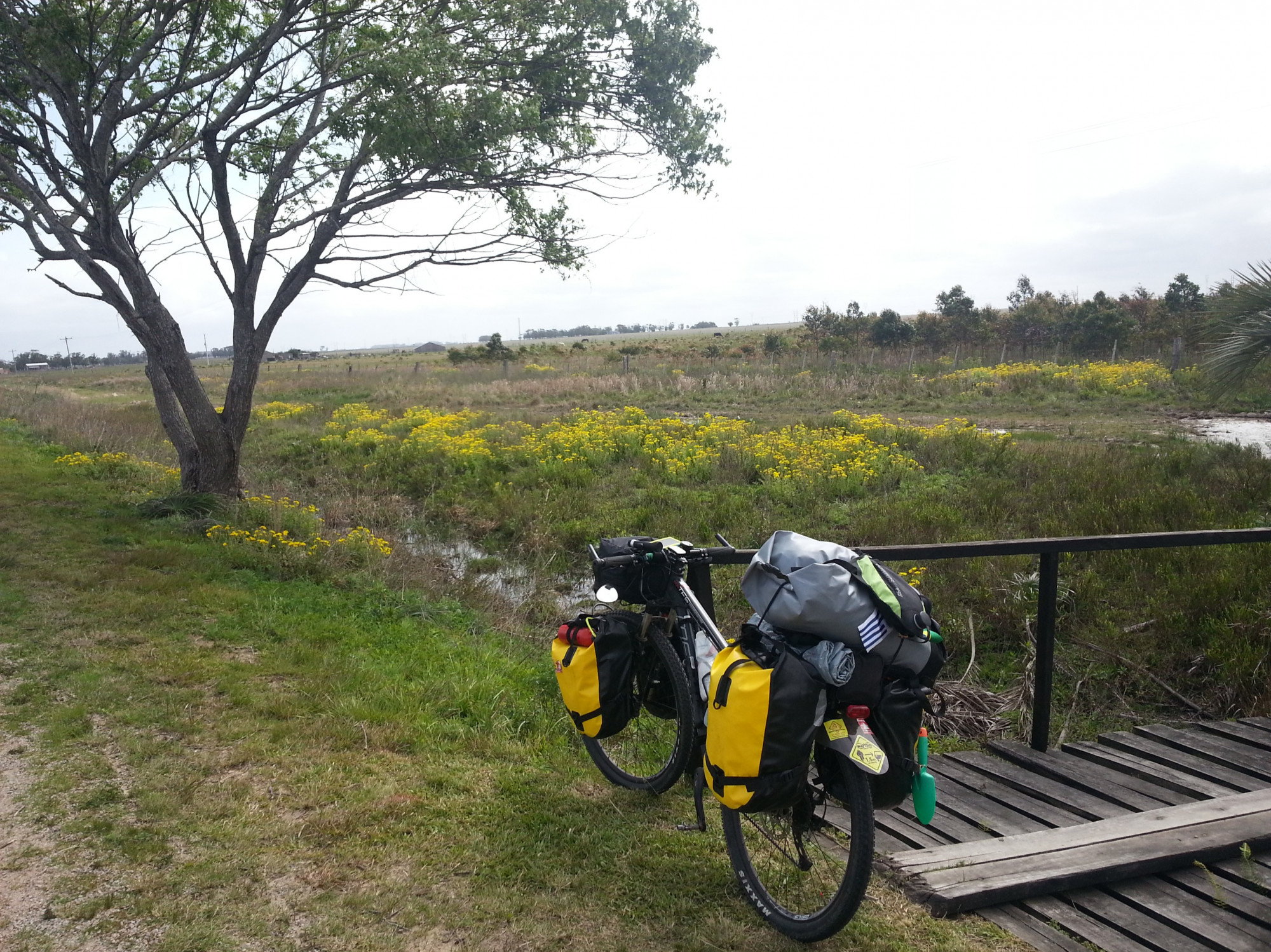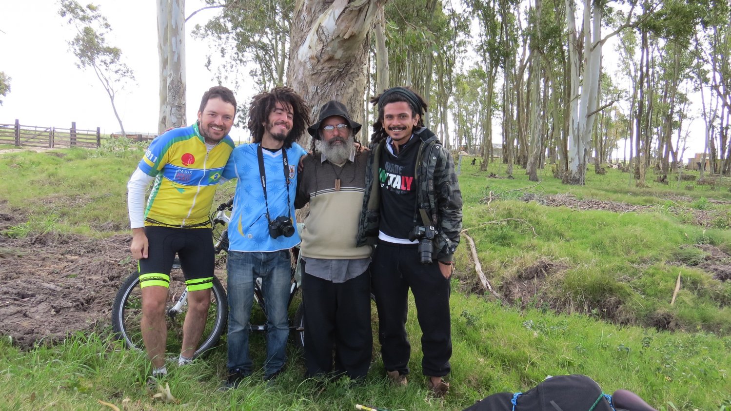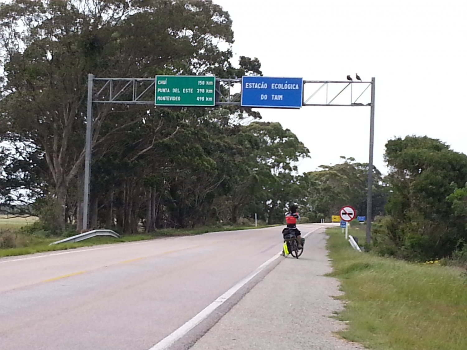 Continuando o relato no dia em que conheci o Leandro e o Wagner conseguimos acampar em uma granja na estrada da reserva do Taim, no dia seguinte, logo cedo tomamos café da manhã no restaurante da granja, pão com manteiga e café, arrumamos nossas coisas nas bicicletas e seguimos viagem, mas antes de sair o guarda da granja nos falou que tinha visto alguns dias antes um viajante com um triciclo amarelo passando pela estrada, seguimos viagem pensando se iriamos encontrar tal viajante, alguns quilômetros à frente encontramos outro cicloturista em nosso caminho que não era o tal viajante do triciclo, ele se apresentou como Bihur Cabe e vinha pedalando desde Goiás, conversamos um pouco e ele seguiu viagem na nossa frente, mais um pouco de pedal e decidimos parar e cozinhar, Bihur aparece novamente havia feito uma pausa e passamos sem notar, após comer ficamos conversando com o Bihur, nos contou sobre sua religião (ele era Judeu) e tocou música em uma flauta de bambu que ele mesmo fez e também falou para as câmeras do Wagner e Leandro, que vão utilizar o material em seu documentário, acho que ficamos parados ali por mais ou menos 3 horas e o Bihur saiu na nossa frente de novo.