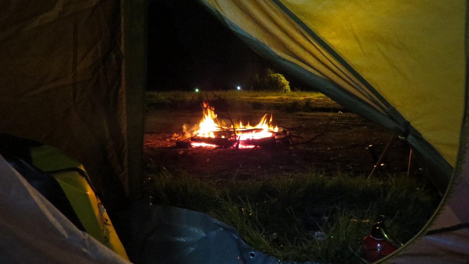 Andamos até passar por uma vila que não sei o nome, tentamos procurar um lugar para acampar, mas sem sucesso andamos mais alguns quilômetros quando encontramos uma fazenda com a porteira aberta e decidimos entrar, logo encontramos o dono da fazenda acompanhado de seu sogro, explicamos que estávamos viajando e pedimos autorização para acampar e fazer uma fogueira para assar os peixes, o dono da fazenda nos mostrou onde pegar lenha e emprestou uma grelha, eu usei pela primeira vez a pederneira que ganhei do meu amigo Rodrigo para acender a fogueira, foi bem legal acender um chumaço de palha seca e colocar no meio dos gravetos secos e ver isso virar uma fogueira que durou a noite toda, cozinhamos arroz para acompanhar os peixes, depois de comer fui tomar um banho no galpão próximo ao local onde montamos as barracas, a noite estava fria mas barraca estava aquecida pela proximidade fogueira.