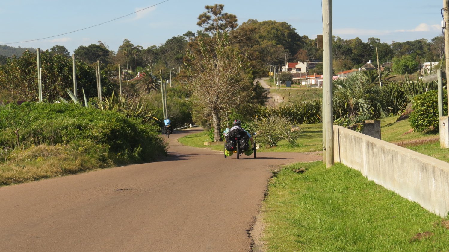 Fizemos nossa rotina matinal de tomar café da manhã e levantar acampamento, naquele dia estávamos todos com preguiça, não sabíamos qual era nossa próxima parada, apenas pensamos em seguir pelo litoral, pedalamos dois ou três quilômetros até um posto de gasolina onde ficamos um bom tempo usando a internet do lugar, eu fiquei impaciente e queria seguir, eu achava que era um tempo precioso desperdiçado ficando parado ali, mais à frente na estrada percebemos que estávamos longe do litoral e entramos em uma pequena estrada que para nós fazia sentido e nos levara de volta ao litoral, nela encontramos um bosque com muitas arvores e decidimos que ali seria um bom lugar para almoçar, pedimos agua em uma casa próxima ao local para cozinhar. Depois de almoçar e descansar um pouco, continuamos pela estrada que em poucos quilômetros chegamos na beira do mar, no início a paisagem era um pouco deserta, com muito espaço entre as casas, mas a visão da praia era linda, aos poucos a paisagem foi se modificando e apareceram algumas casas a mais, estávamos em Punta Colorada, é difícil decidir se o lugar é bonito pela natureza ou pelo charme da vila que ali está. Mais alguns quilômetros e chegamos em Piriápolis, fizemos uma pausa no porto para usar o banheiro, lembro que nesse porto haviam mais veleiros que em Punta del Este, também fizemos uma pausa em um posto para fazer um lanche no fim da tarde e então seguimos para Las Flores, onde iriamos procurar um lugar para passar a noite.