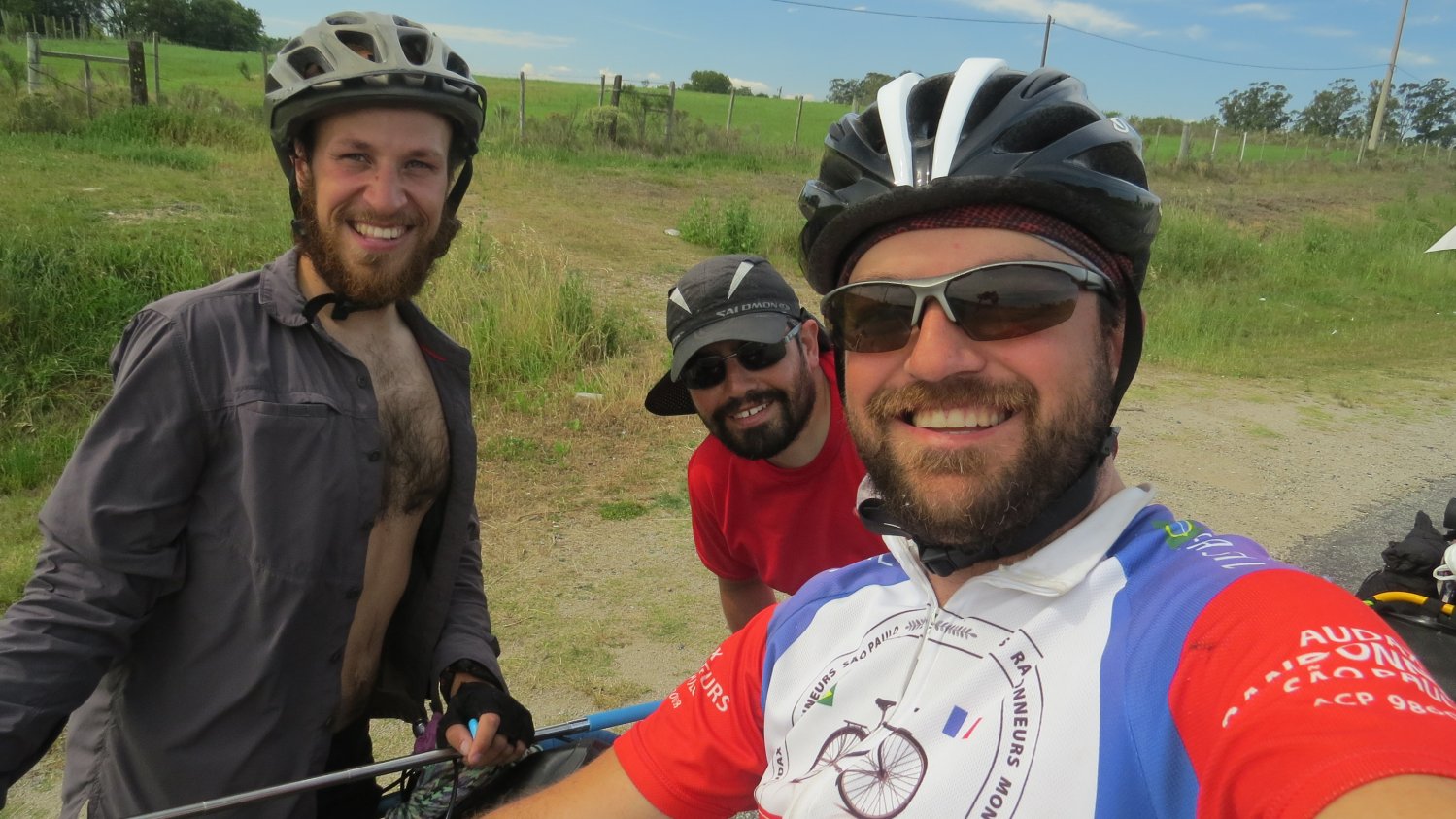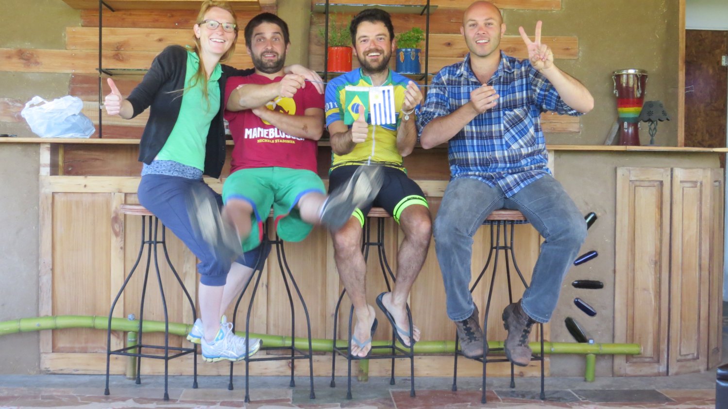 Pedalei algumas quadras seguindo o carro até chegar em uma propriedade no limite da cidade, onde haviam duas construções, uma casa mais ao fundo e um prédio construído de adobe, uma espécie e massa feita com barro e palha em uma armação de madeira, e com grandes janelas de vidro, meus anfitriões Nicolas e Ann, ele uruguaio e ela belga, me explicaram que ali era um restaurante que estaria aberto em duas semanas e toda a construção foi feita por eles. Nesse dia tinha um jogo de futebol entre Brasil e Argentina, Nicolas ligou para um amigo que morou no Brasil para vir ao restaurante assistir ao jogo, Francisco chegou falando português, assistimos ao jogo e comemos pizza feita pelo Nicolas, conversamos um pouco e claro eu expliquei a minha viagem, nesse dia eu estendi o meu saco de dormir em um canto dentro do restaurante. No dia seguinte, enquanto arrumava as minhas coisas para partir, Nicolas me mostrou o resto da propriedade e a horta que tinha no fundo da casa onde cultivava parte dos ingredientes que iria utilizar em seu restaurante, ele ainda me deu um pouco de morangos e ervilhas colhidos de sua horta, quando estava quase indo embora Francisco passou ali novamente para se despedir.