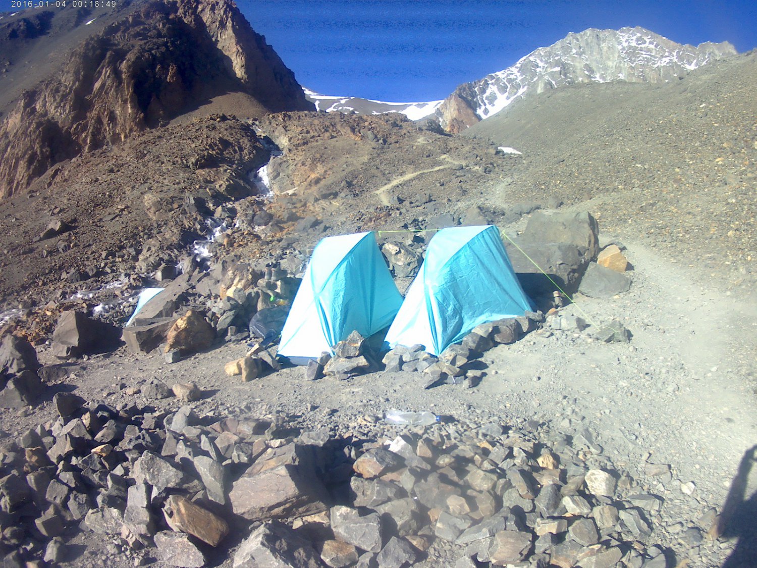 Continuando nossa expedição, a programação do dia 11, considerado o dia tão esperado, iniciou-se de madrugada, com o Igor optando em ficar no acampamento Salto, eu acordei as 2:30 horas da madrugada, numa noite muito fria, partindo em direção em cume, durante cerca de uma hora e meia não vi nenhum outro montanhista a caminho do cume, as 3:30 horas olhei para traz em direção ao acampamento Salto, e percebi que outras luzes vinham no mesmo caminho, eram outros montanhistas que também iriam fazer o ataque ao cume, o que me fez sentir um certo alivio, pois não estaria mais sozinho na escuridão. Caminhando por cerca de mais meia hora cheguei ao Acampamento La Hoyada (4.600m), este algumas vezes utilizado por montanhistas, porém pelo fato de ventar bastante no local, não foi utilizado pela nossa expedição, pois bem, após passar por este acampamento me deparei com uma geleira montanha acima, na qual eu não conseguia visualizar a trilha rumo ao cume, como alternativa, optei por consultar meu mapa off-line através do app maps.me, no qual consegui me localizar.