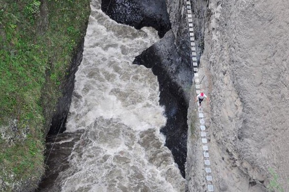 Tem várias opções de tirolesa em Baños, mas a mais bacana é a Canopy Puerta del Cielo porque é a mais longa e oferece uma série de atividades. A primeira é a tirolesa de mais de 1.000 metros sobre o rio, depois você atravessa uma Ponte Tibetana.