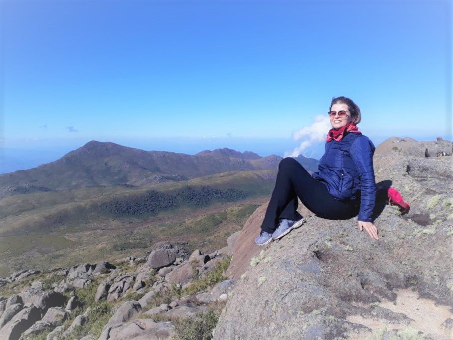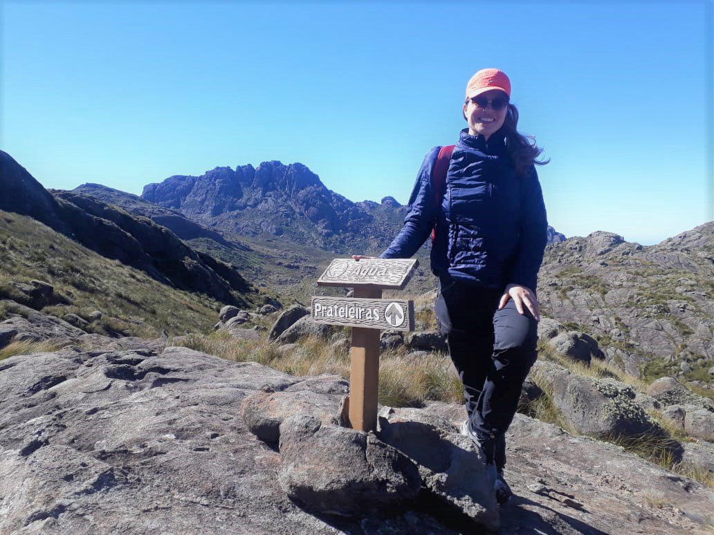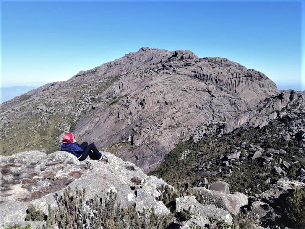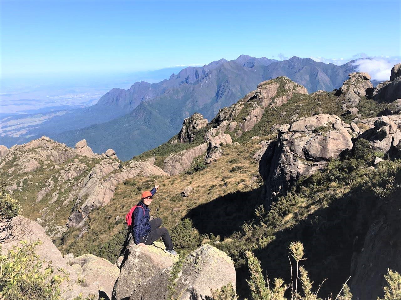 Dia seguinte, após um belo café, estava pronta para os objetivos: Morro do Couto e Base de Prateleiras, na foto acima na subida para o Morro do Couto estou apontando para Serra Fina, nesse momento determinei minha próxima travessia, fiquei encantada com seu perfil topografico, um desafio aos amantes da natureza e aventureiros, após vê-la tão destacada no horizonte me convoquei para subi-la rsrs.