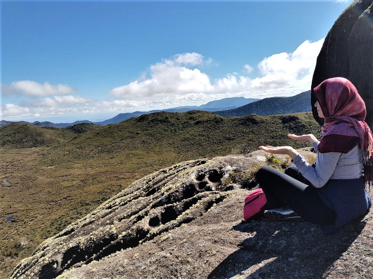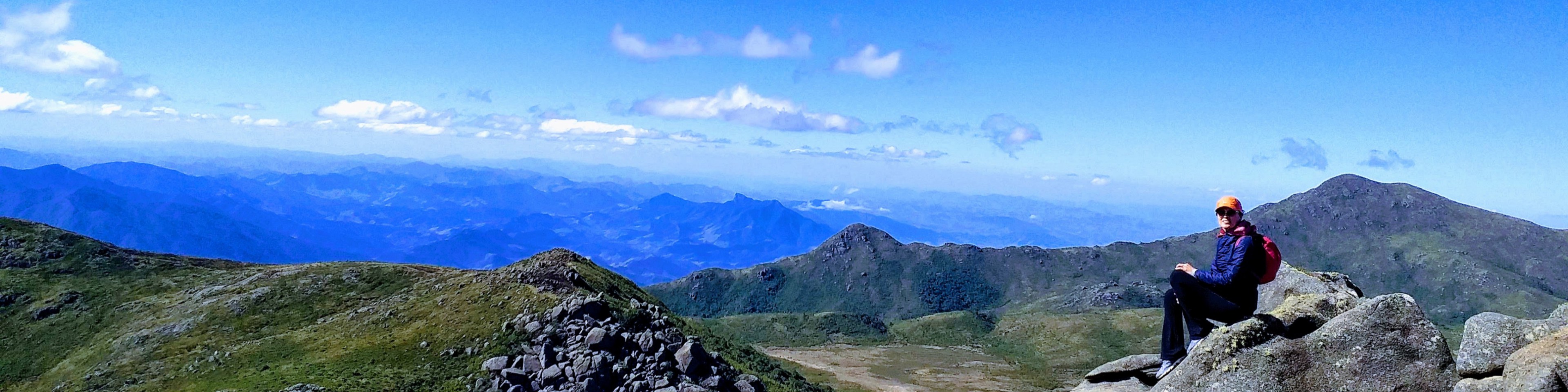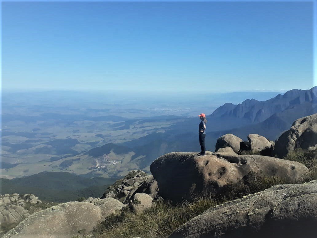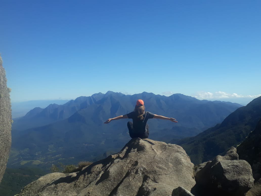 Dia seguinte, após um belo café, estava pronta para os objetivos: Morro do Couto e Base de Prateleiras, na foto acima na subida para o Morro do Couto estou apontando para Serra Fina, nesse momento determinei minha próxima travessia, fiquei encantada com seu perfil topografico, um desafio aos amantes da natureza e aventureiros, após vê-la tão destacada no horizonte me convoquei para subi-la rsrs.