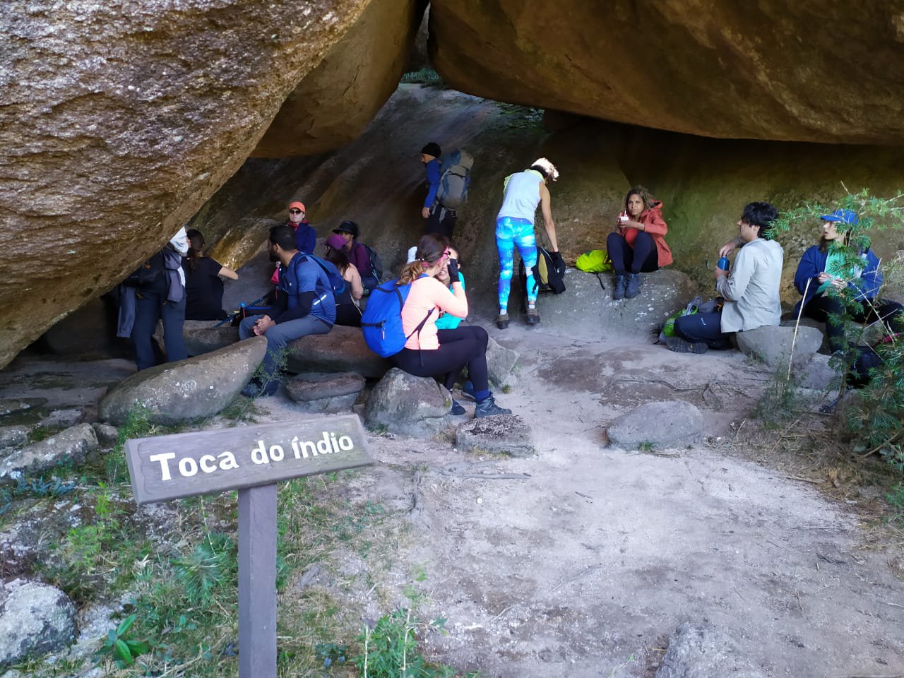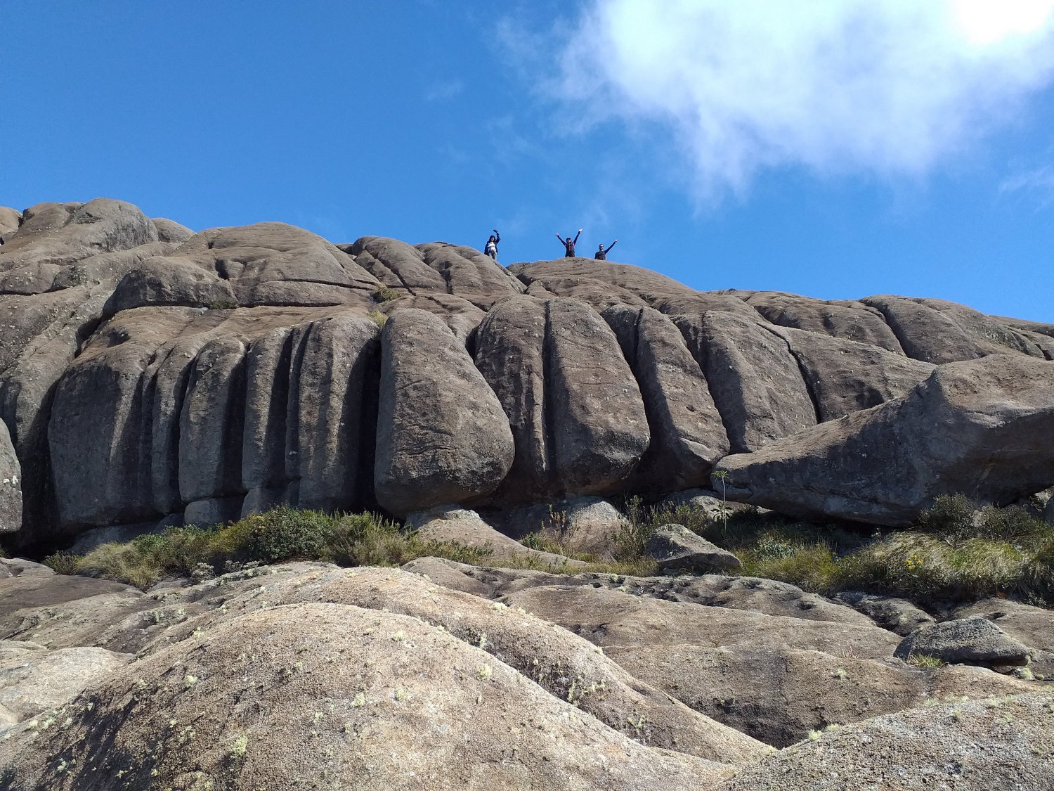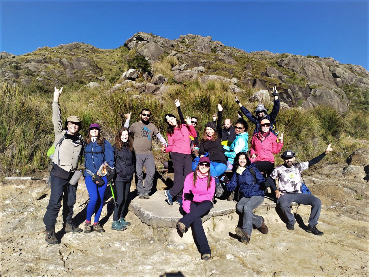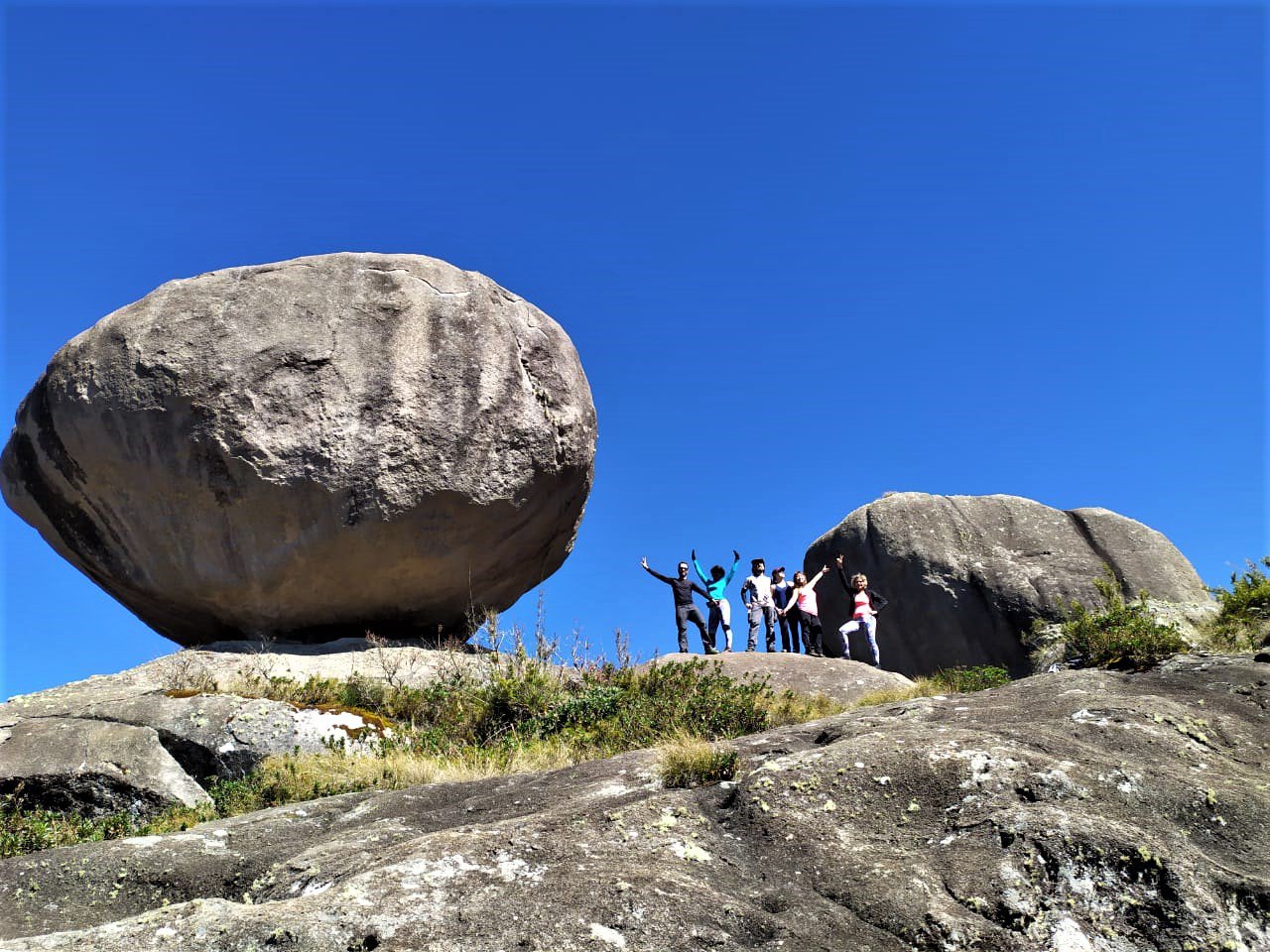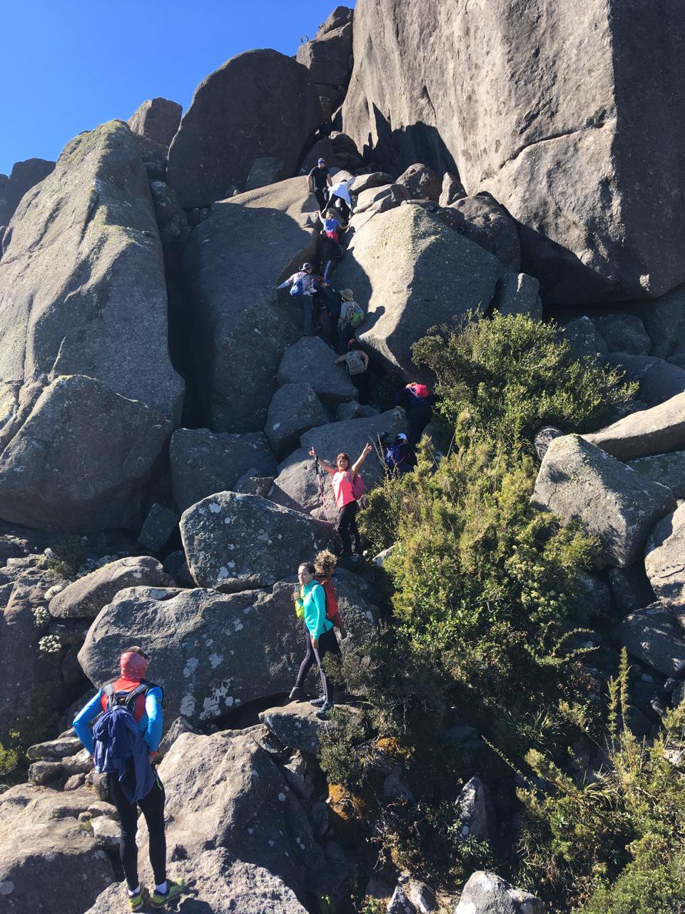 Quando chegamos no topo foi uma festa, todos queriam ficar próximos ou debaixo das pedras, como se pode ver na foto acima.