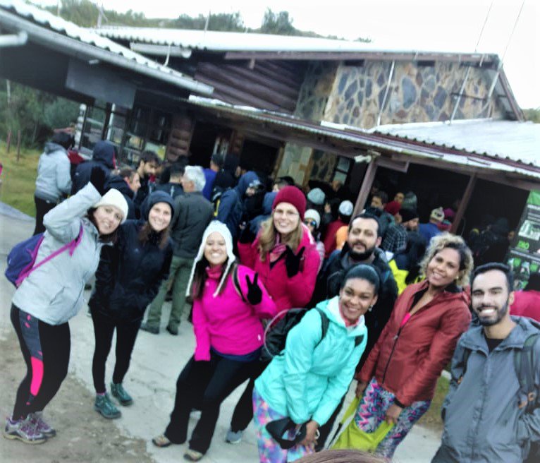 No posto do Marcão ficamos aguardando liberação dos guias, por ser período de férias estava lotado, então o jeito foi conversar, fazer novas amizades, alongamentos e tirar fotos para espantar o frio.