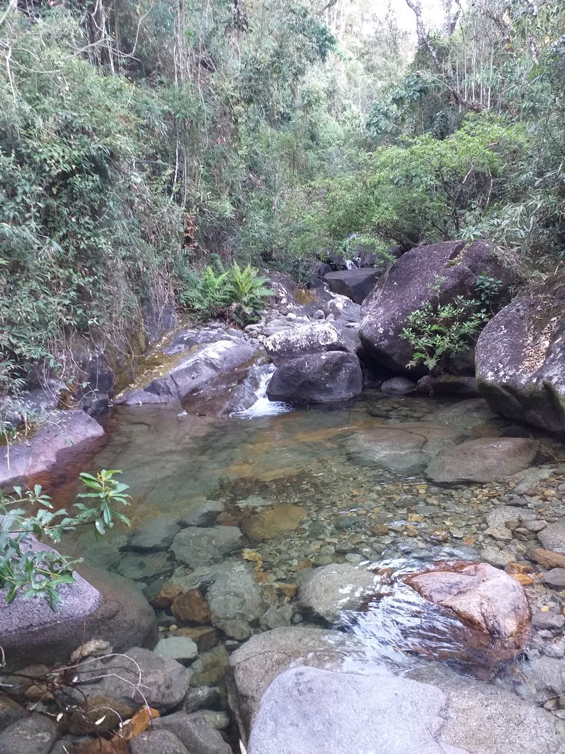 Após caminharmos menos de 1 hora de trilha, encontramos uma cachoeira com água transparente, limpíssima, um convite para o banho na volta rs.