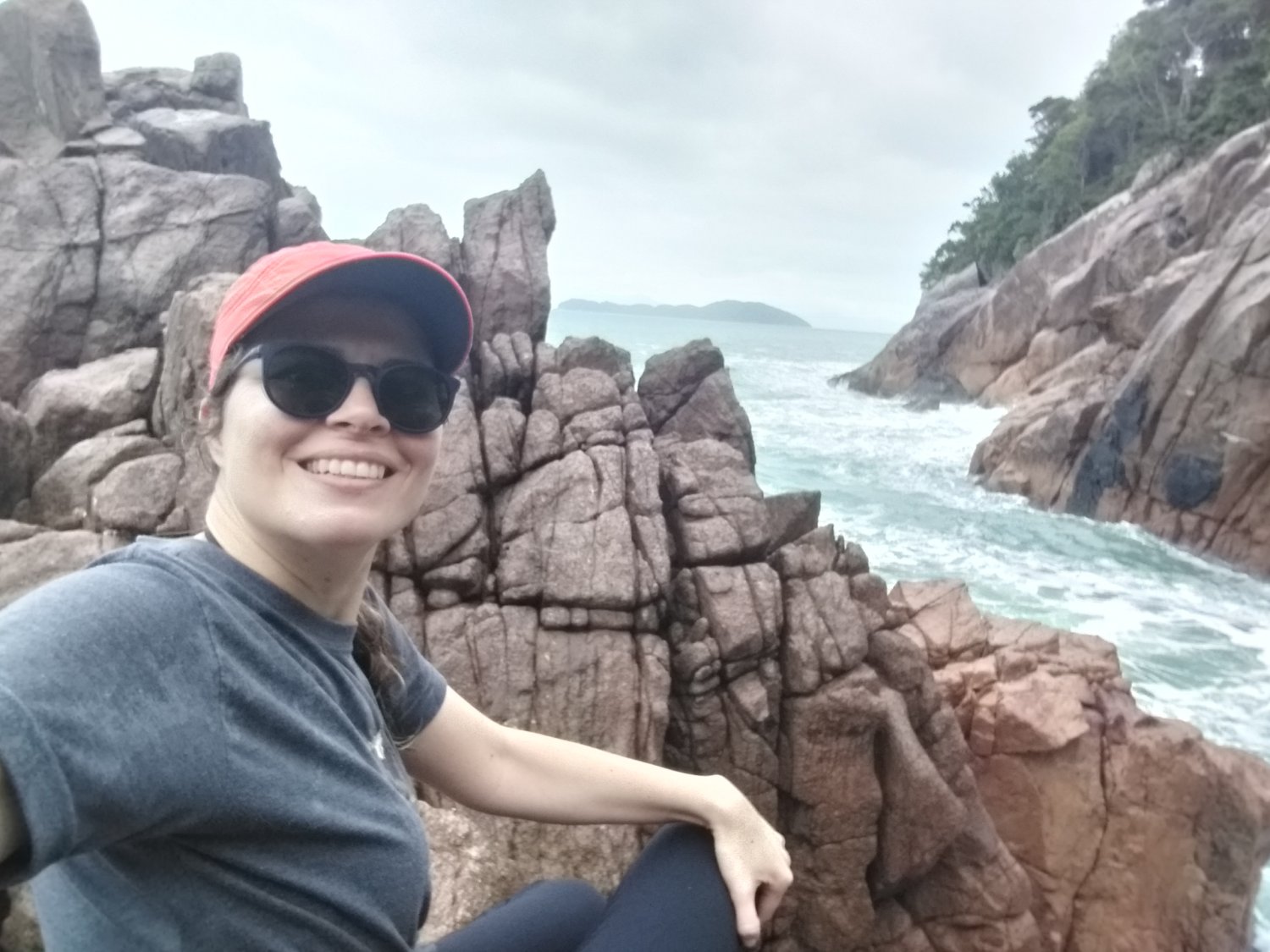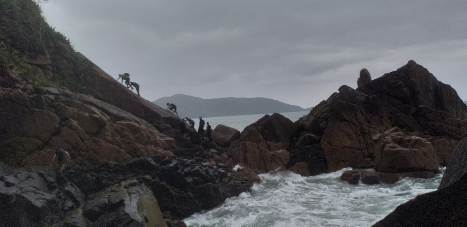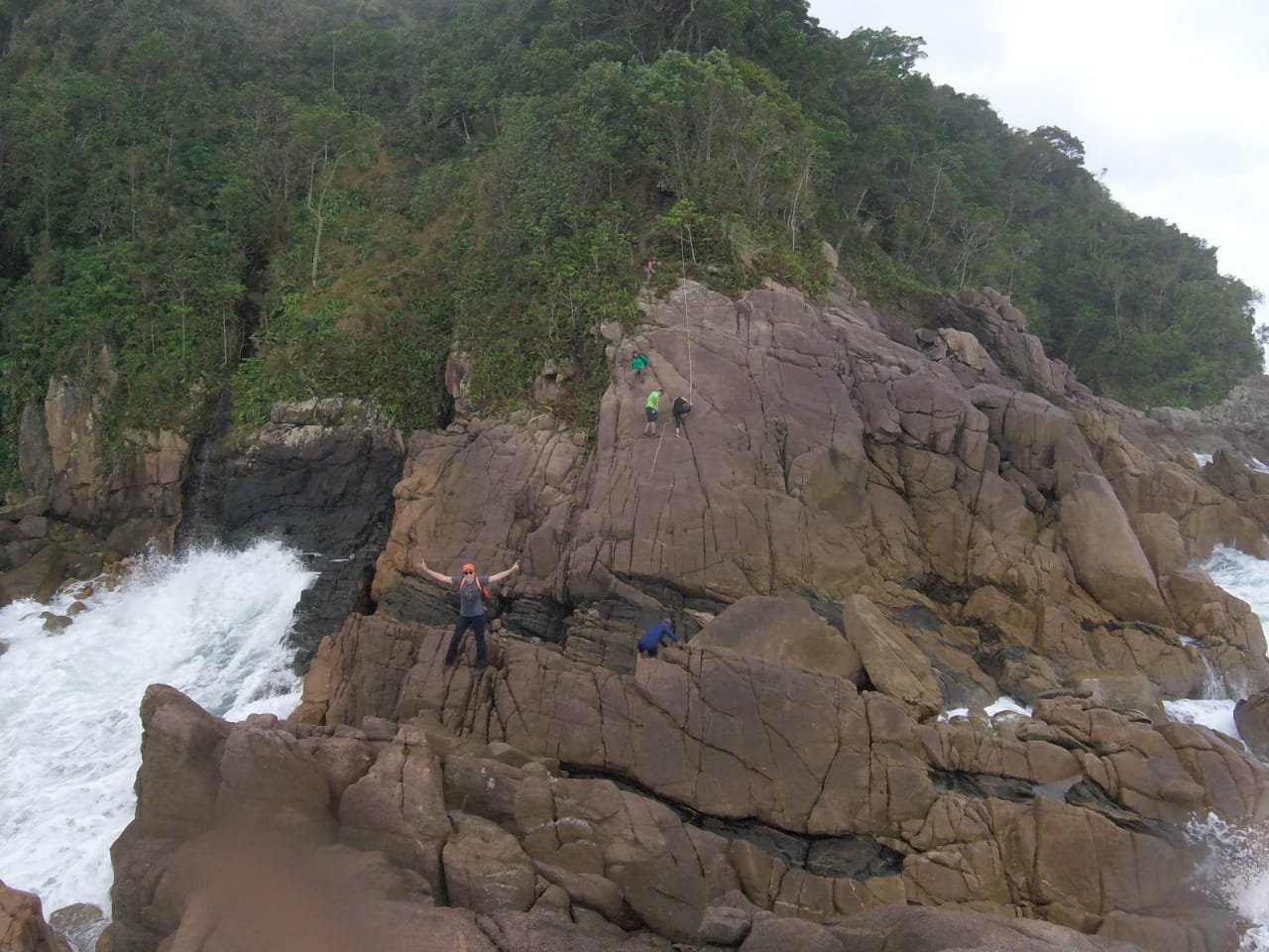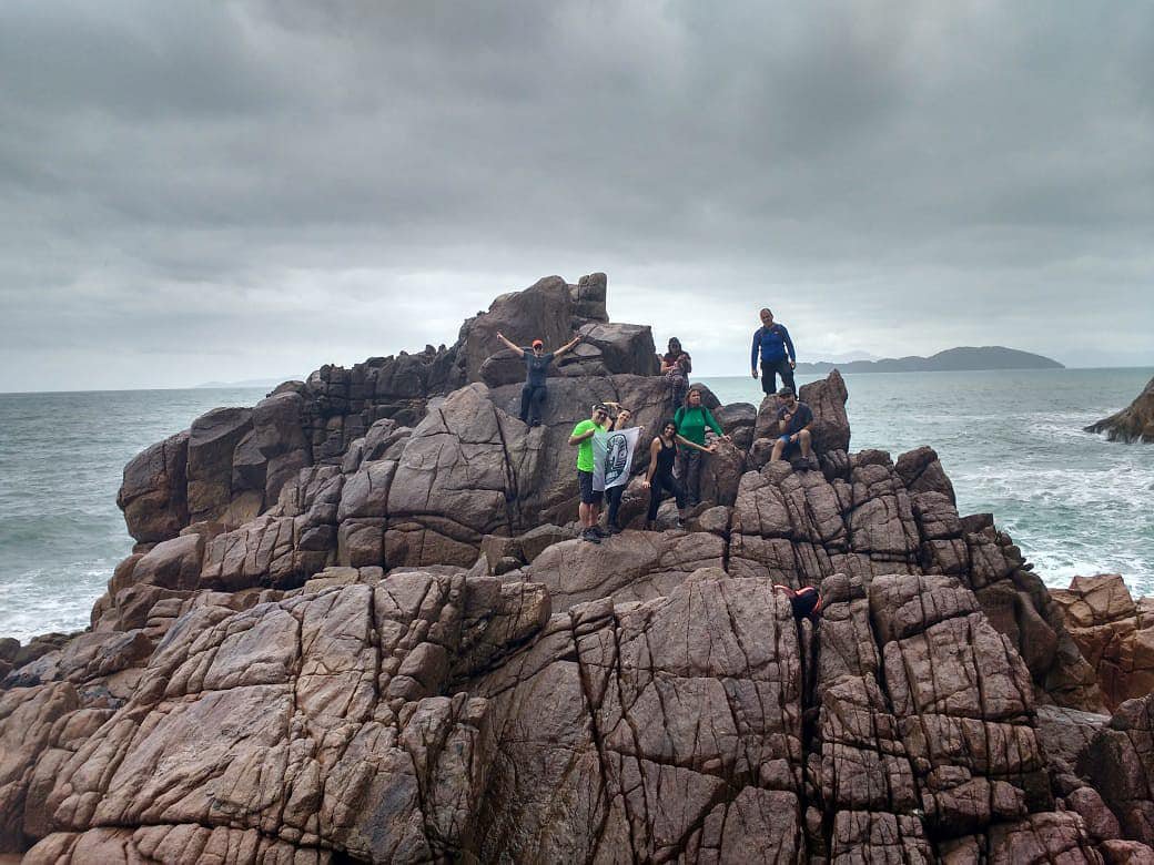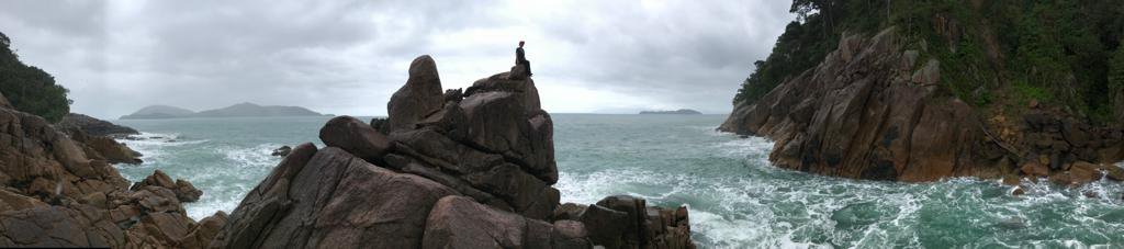 A descida pela pedra que faz um mirante pelo mar é a parte mais bonita dessa trilha, o mar quebra as ondas nas pedras e pode se ficar admirando a paisagem linda.