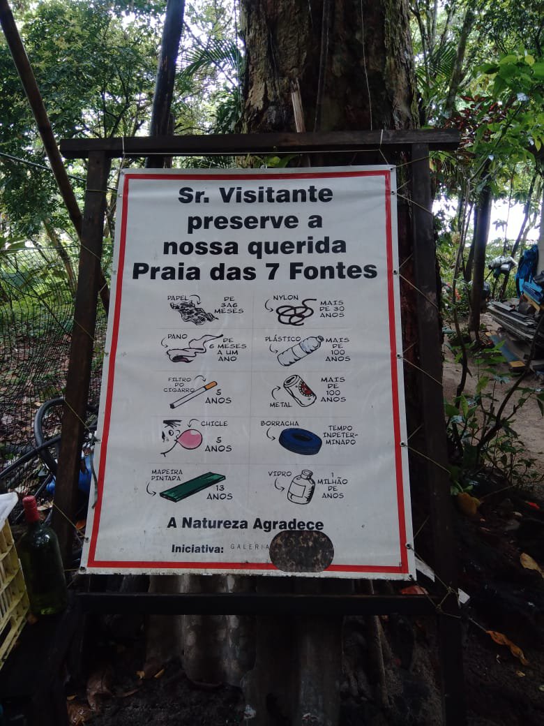 Iniciamos nossa trilha as 10 hs caminhando pela praia, após 4km chegamos a praia 7 fontes que tem uma água maravilhosa. A praia estava vazia, nessa data não tem turistas, os moradores são poucos pescadores, mesmo com esssa placa encontramos lixo na praia uma falta de conciência.