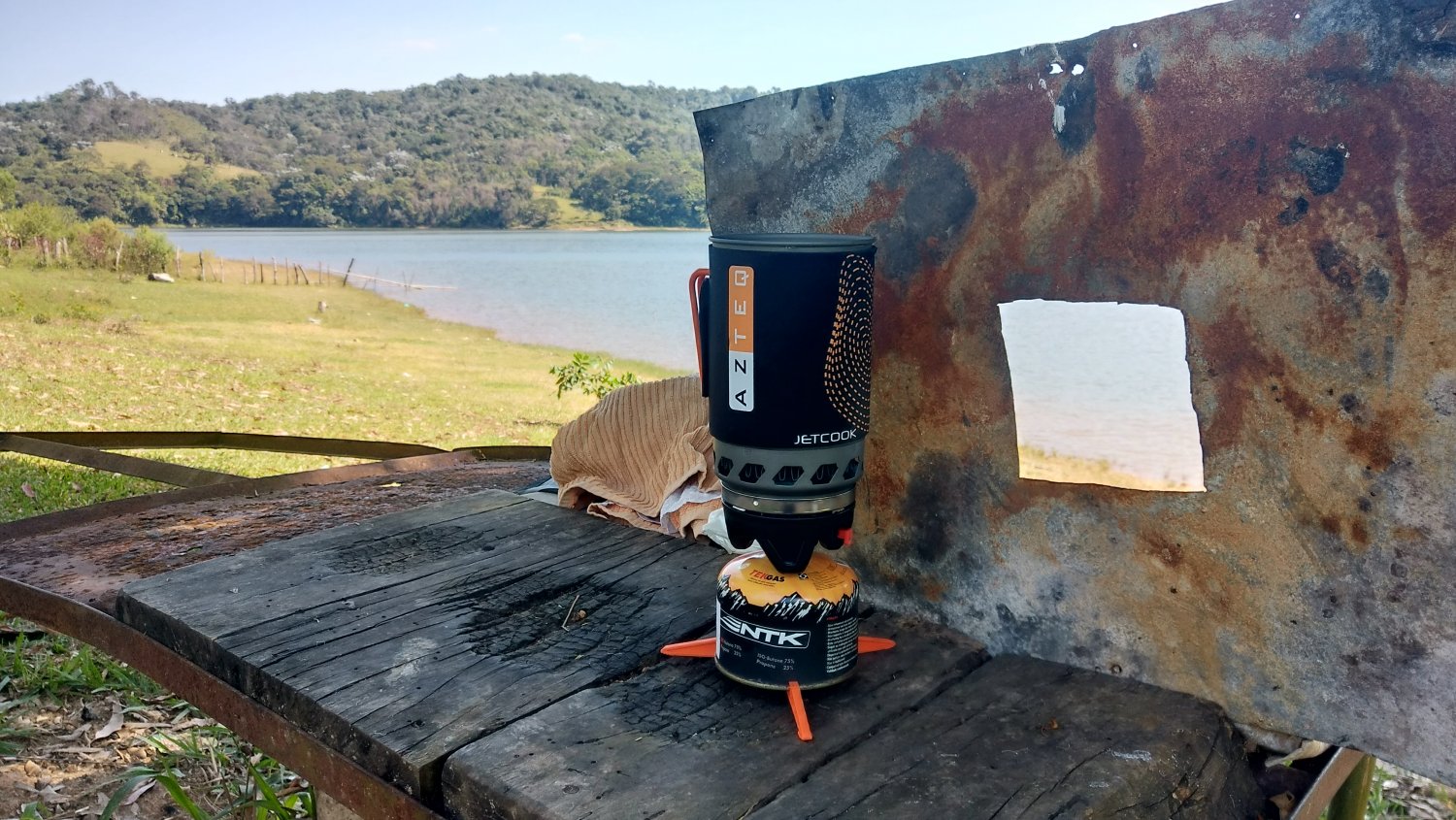 Eu tinha planejado fazer o almoço lá (pelo amor de Deus, miojo não é comida!) e levei fogareiro e os alimentos. Essa é uma parte aprazível da viagem. E eu estava realmente faminto quando cheguei no "restaurante a céu aberto".