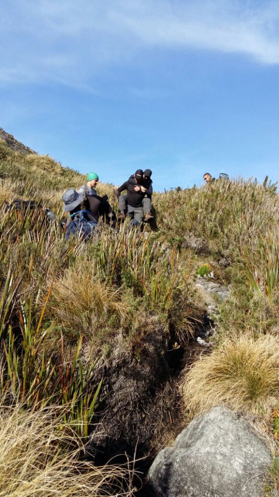 Todos estávamos com MUITA sede e sem água. Chegamos a considerar em beber a água da chuva que fica entre as pétalas das bromélias.... Este trecho foi bem tenso principalmente pra mim, pois não estava com firmeza no joelho e caí diversas vezes... Mais uma vez, agradeço ao Ronaldo pelo cuidado e auxílio neste trecho.