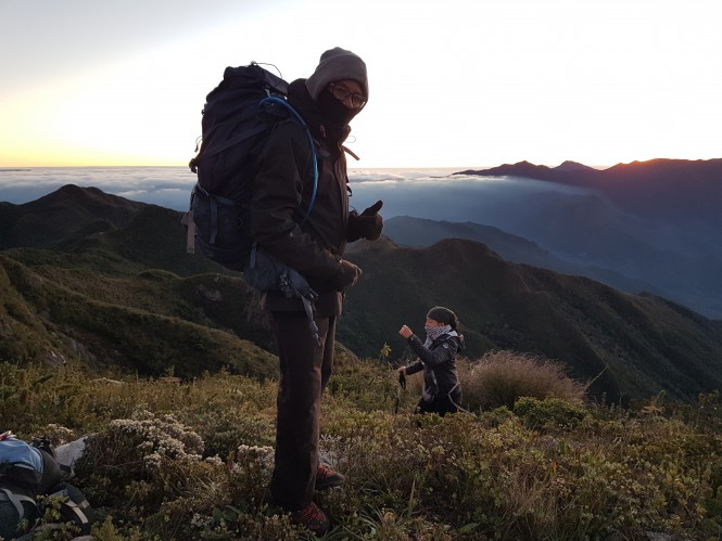 Enfrentamos uma subida que foi extremamente cruel comigo: muito íngreme, com MUITO barro e lamaçal.... Escorreguei várias vezes e estava apavorado com a ideia de me machucar mais ainda. Infelizmente não conseguimos avançar muito rápido e tivemos de assistir o nascer do sol antes do Pico dos Três Estados (o que não foi NADA FEIO rsrs).