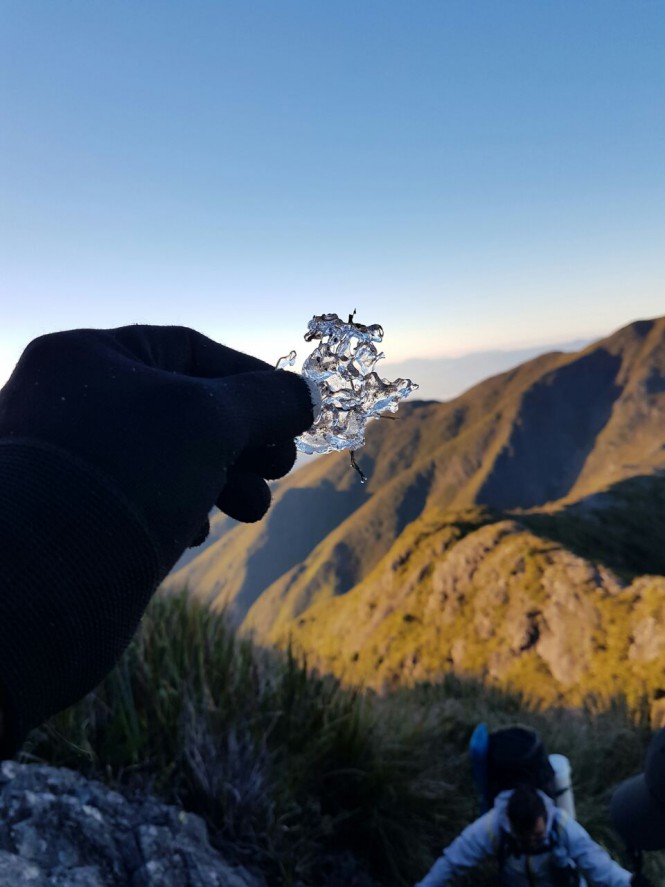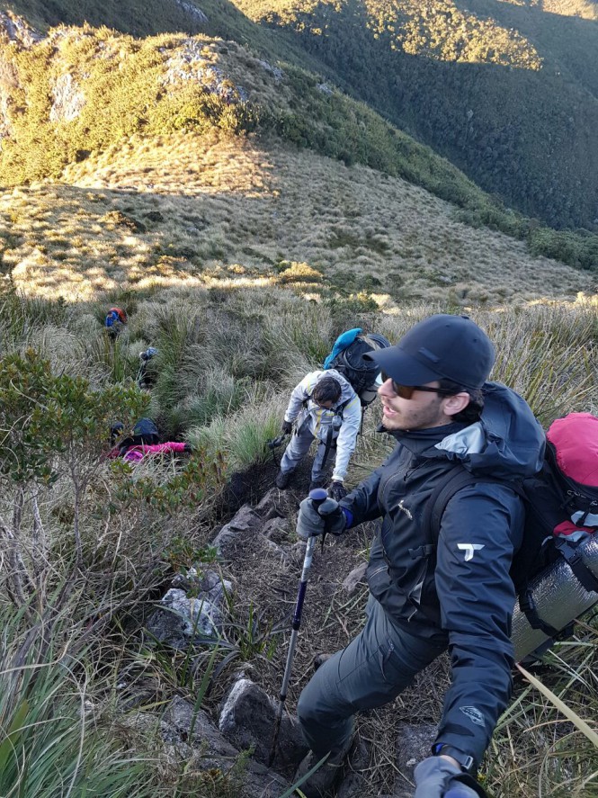 DIA 1: Começamos a trilhar aproximadamente 4:30 da manhã. Logo que atingimos a famosa crista da Serra Fina, um espírito iluminado chamado Wagner,Washington ou Wellington surgiu quando me viu reclamando do joelho e mancando: ele me ofereceu ajuda e colocou uma fita de compressão, passou dorflex em spray e me deu algumas dicas sobre como amenizar o impacto no joelho.