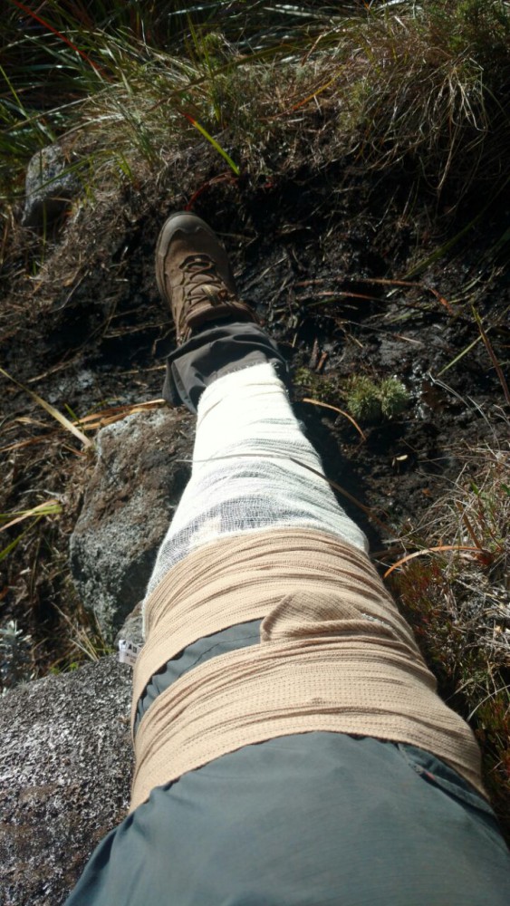 Eu estava atordoado por causa da dor e não me lembro quem fez a tala em mim, mas lembro que foi com um bastão de caminhada por dentro da calça e amarrado com uma faixa que eu tinha no meu kit de primeiros socorros.