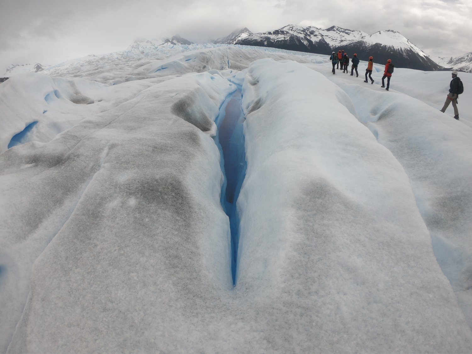 Caminhamos ao lado gretas com águas cristalinas. Também paramos para ouvir a água escorrendo pelos sumidouros, verdadeiros "ralos" onde a água some pela geleira.