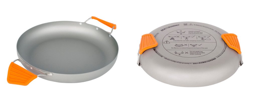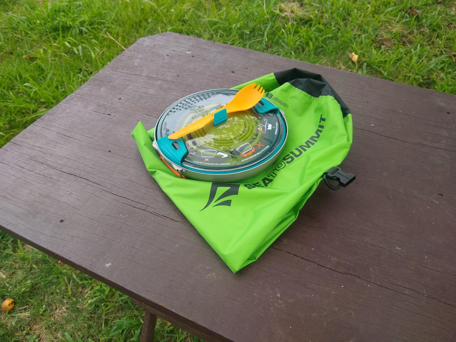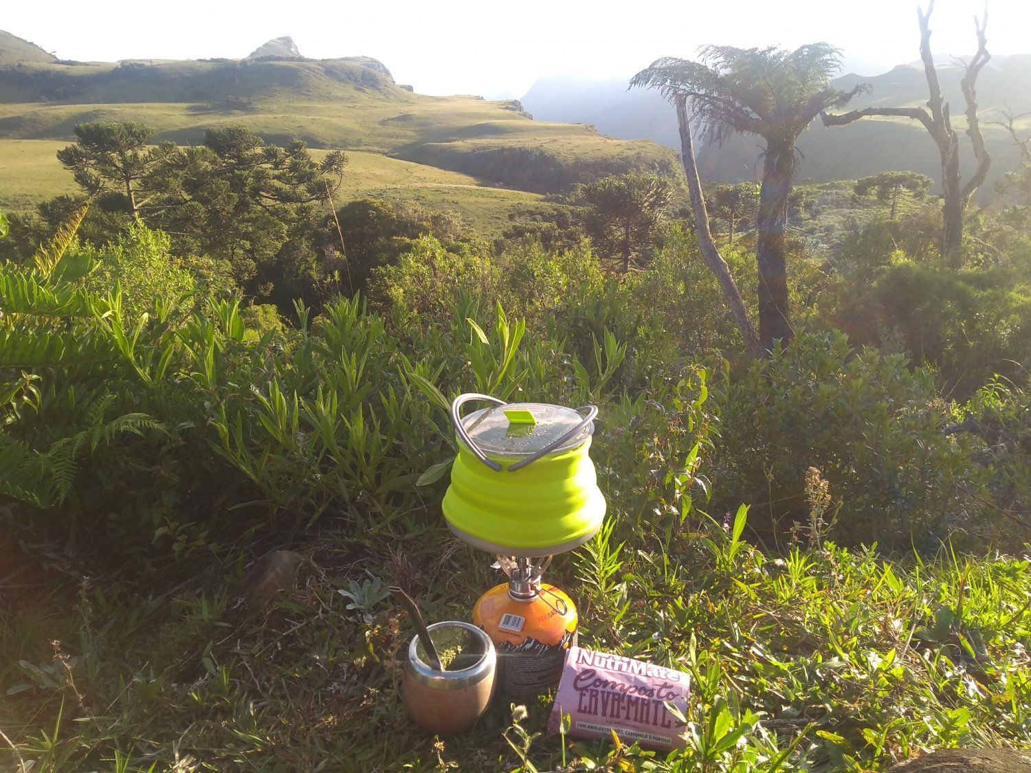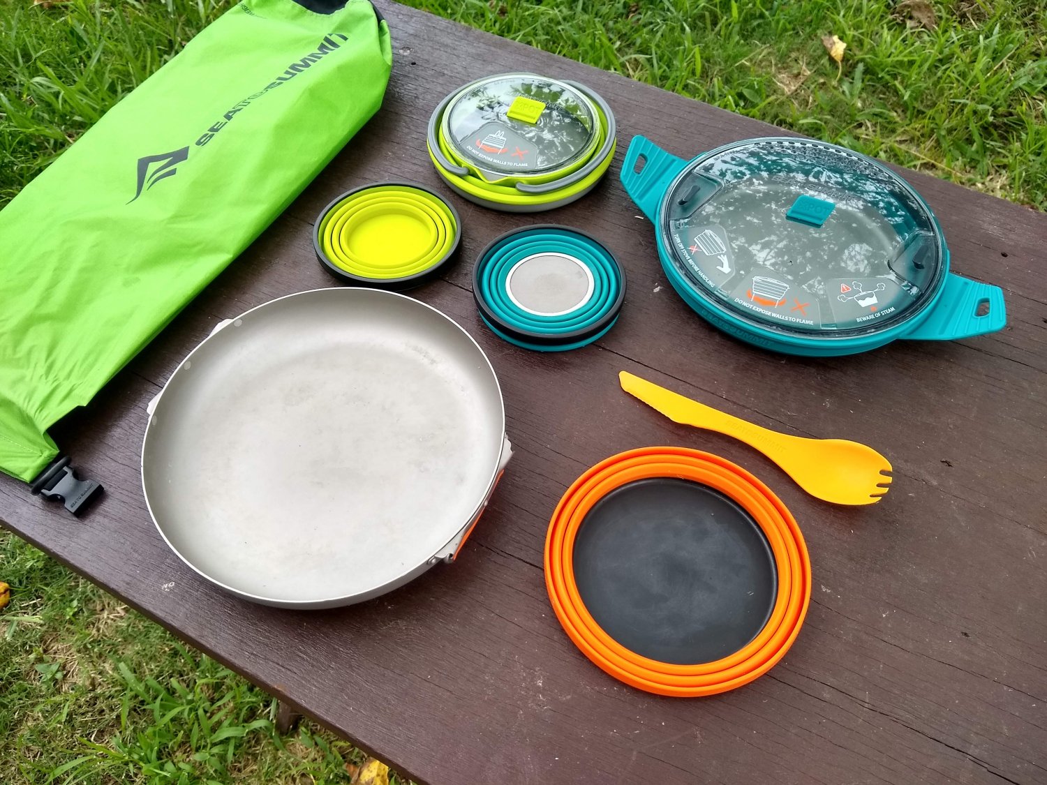 Antes de colocar o conjunto de cozinha na mochila, faço meu planejamento prévio de cardápios, e isso vai definir o que eu devo levar. Se optar pela comida liofilizada, não levo a panela, pois a chaleira basta. Se for de comida termoprocessada, que falaremos num próximo review, levo a panela, visto que preciso de um volume maior de água para preparar em banho-maria. Se o café da manhã vai ter ovos mexidos com bacon, e frequentemente tem, preciso da frigideira. Assim, vou encontrando o formato adequado do conjunto. Sempre tenho junto toalhas de papel e um mini kit de limpeza, com esponja e detergente biodegradável.