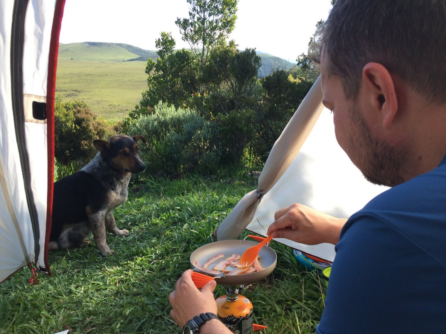 Na foto, com certeza absoluta, a Pampa, essa cãompanheira de trekking pelos campos de altitude em São José dos Ausentes, ganhou um bom café da manhã, com direito a bacon, ovos e pão.