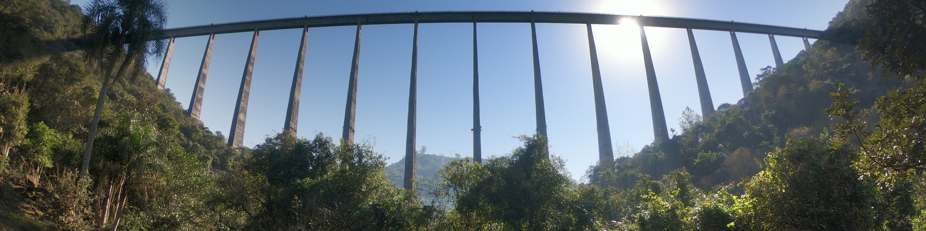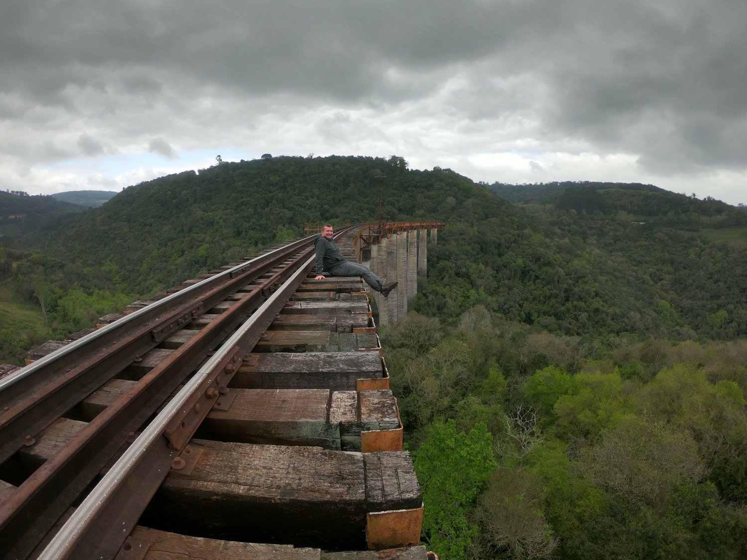 Para ir até o ponto de início pegamos um ônibus de linha que faz o trajeto entre Muçum e Guaporé. Descemos na rodovia e procuramos o início da ferrovia. Não foi difícil de achar. Às 11h30 do dia 20/09, feriado no RS, começamos a travessia, sendo o camping Casa Recanto da Ferrovia nosso objetivo. Nosso almoço/lanche foi na cabeceira do Viaduto Mula Preta (foto), o primeiro viaduto vazado da travessia, com 360 metros de comprimento e 98 de altura. É uma experiência incrível e alguns travam na travessia. Além da vertigem, tem o temor de deparar-se com o trem em pleno viaduto, pois não há guarda-corpo na lateriais e os refúgios não são muitos.