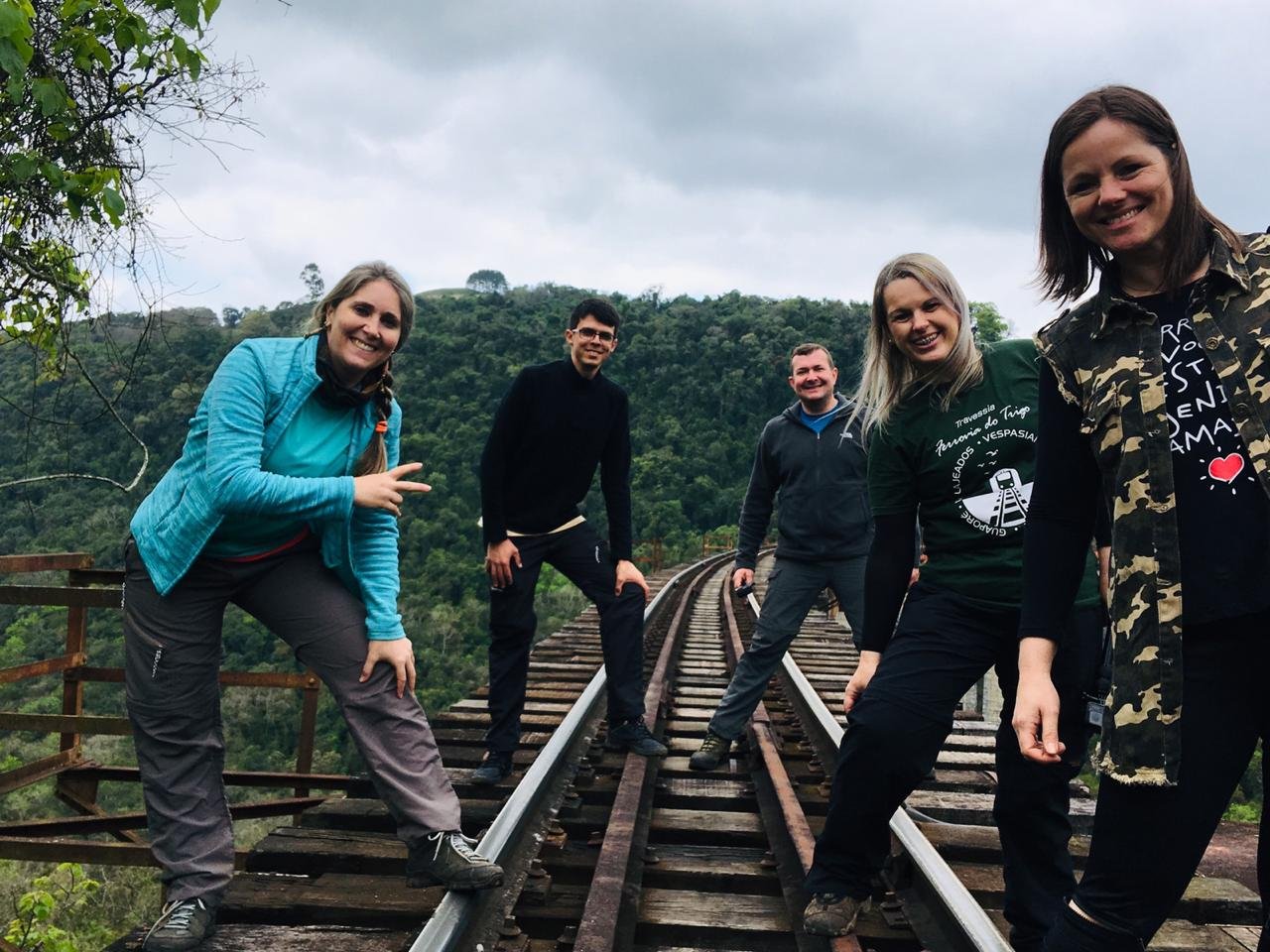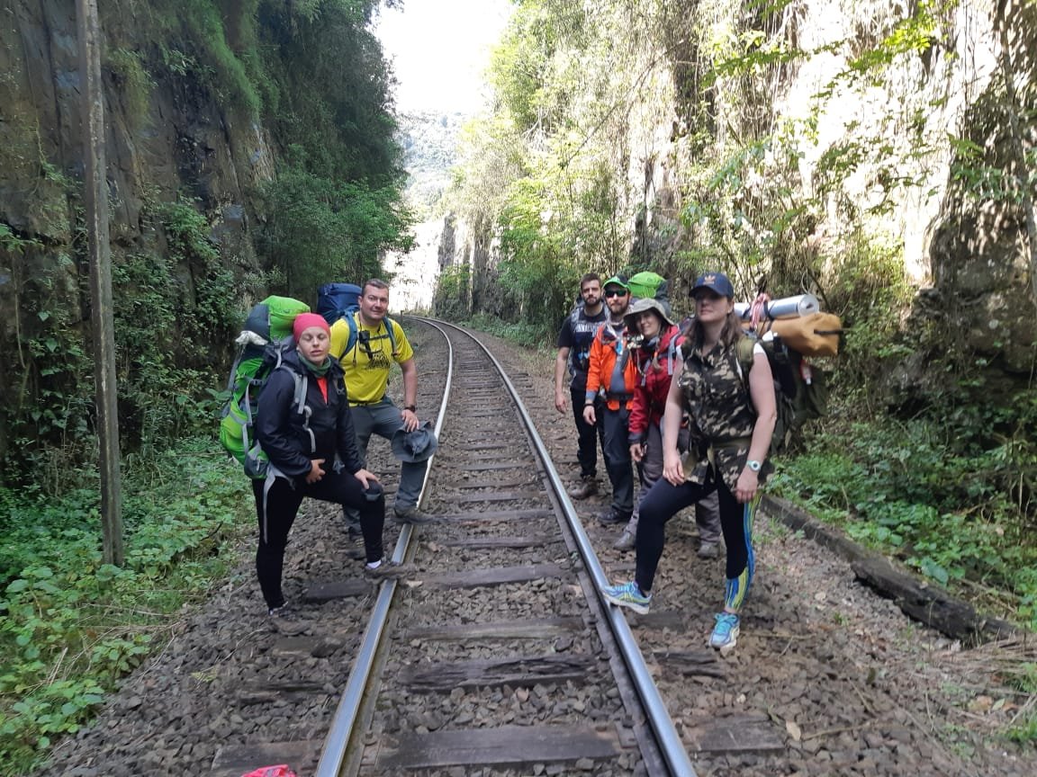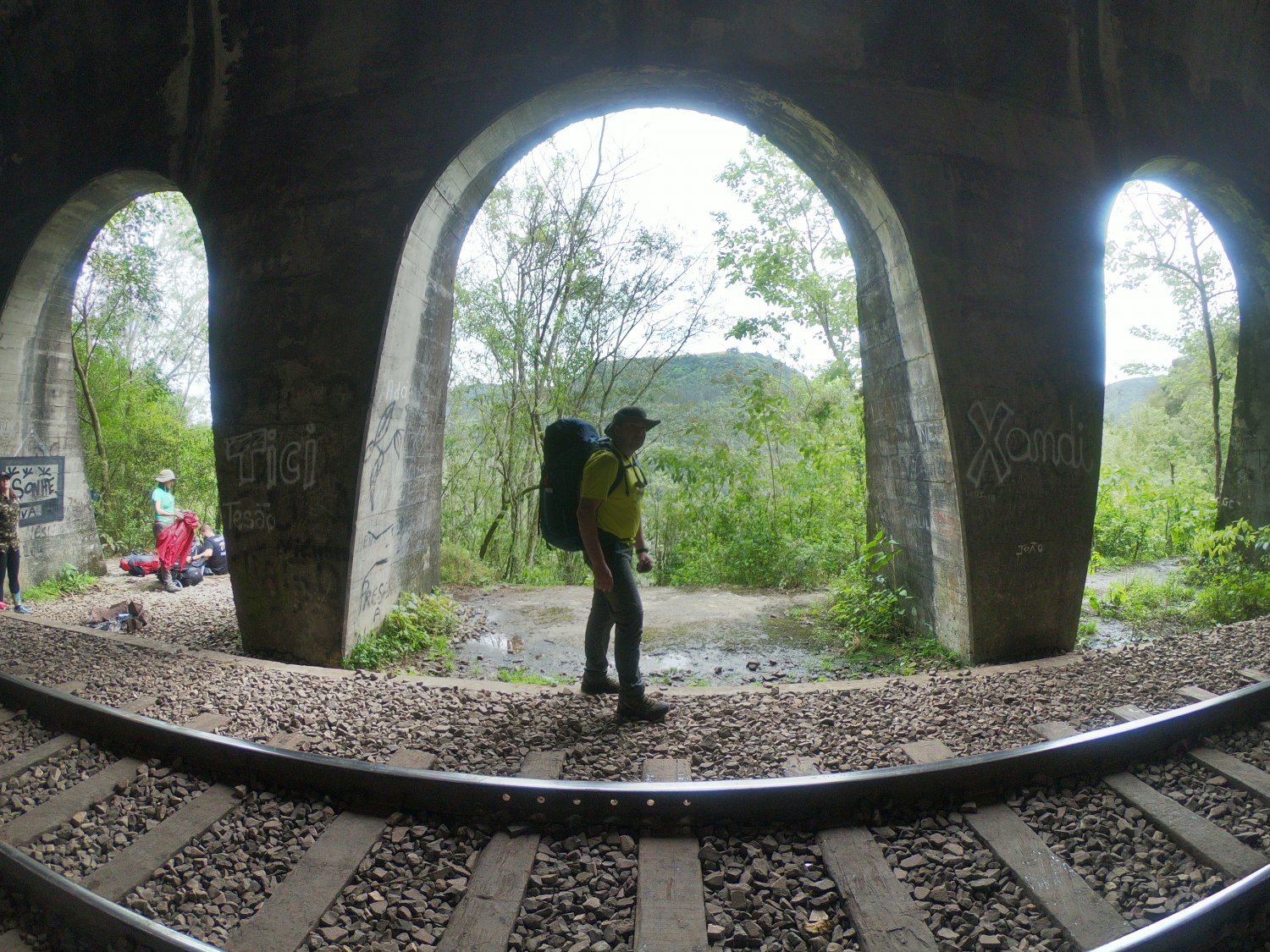 2º dia - O trem nos acordou cedo, passou às 6h30 e, com isso, dificilmente o veríamos durante o dia. Iniciamos a caminhada às 7h30, após tomar café da manhã, e logo no início enfrentamos o Viaduto Pesseguinho, o segundo viaduto vazado do trajeto, com 268 metros de comprimento e 86 metros de altura. Já estávamos craques.