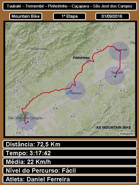 1ª Etapa - Taubaté – Tremembé – Pinheirinho – Caçapava – São José dos Campos - 72Km - 01.09.2016