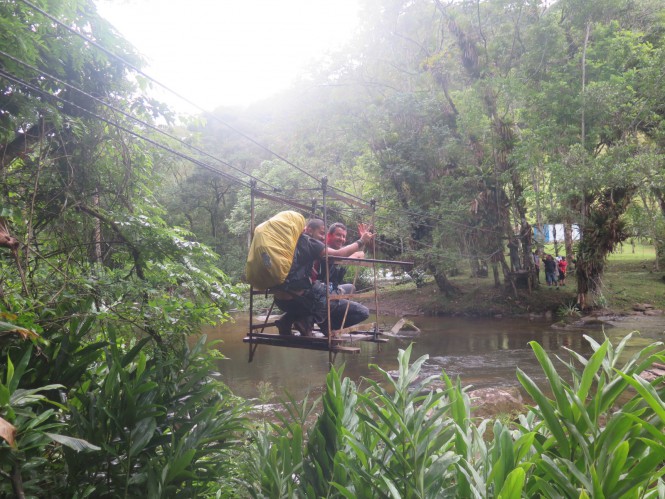 Acordamos cedo, não chovia e prometia ser um dia com até sol, nosso plano era sair as 7h, pois havia chão até o fim da trilha... Assim nos arrumamos o mais rápido possível e saímos para atravessar lá na frente o rio mambucaba (se não me engano) - há uma gaiolinha que cobram 10 reais por pessoa, confesso que queria ter acampado ali ao lado do rio e com 3 senhores legais que ofereceram cafézinho.