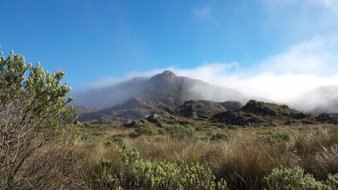 Fazendo companhia no abrigo temos nosso ratinho de estimação, o Rodolfo que sempre está por lá atrás de comidinhas esquecidas e que caem no chão, ele é gordinho, sinal de que comidinhas não faltam. Amanhece um lindo domingo após uma noite de estrelas, com sol gostoso de outono que aquece mas não tosta nossas caras. Após limpeza e arrumação do abrigo vamos encarar os 2680 metros de altitude do Morro do Couto, onde a subida desafia limites, mas nos dá a recompensa mais esplendorosa de todo o parque, lá do alto avistamos todas as montanhas do Itatiaia, toda a Serra Fina com a proeminência da Pedra da Mina e lá bem longe em Aiuruoca (cidade), o Pico do Papagaio.