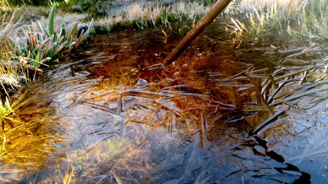 Descemos ao Vale para instalar o termômetro e coletar a temperatura para depois comparar com as do termômetro da parte alta do Parque Nacional do Itatiaia, estava tudo congelado, capim, água, vegetação rasteira, solo, era como entrar num freezer.