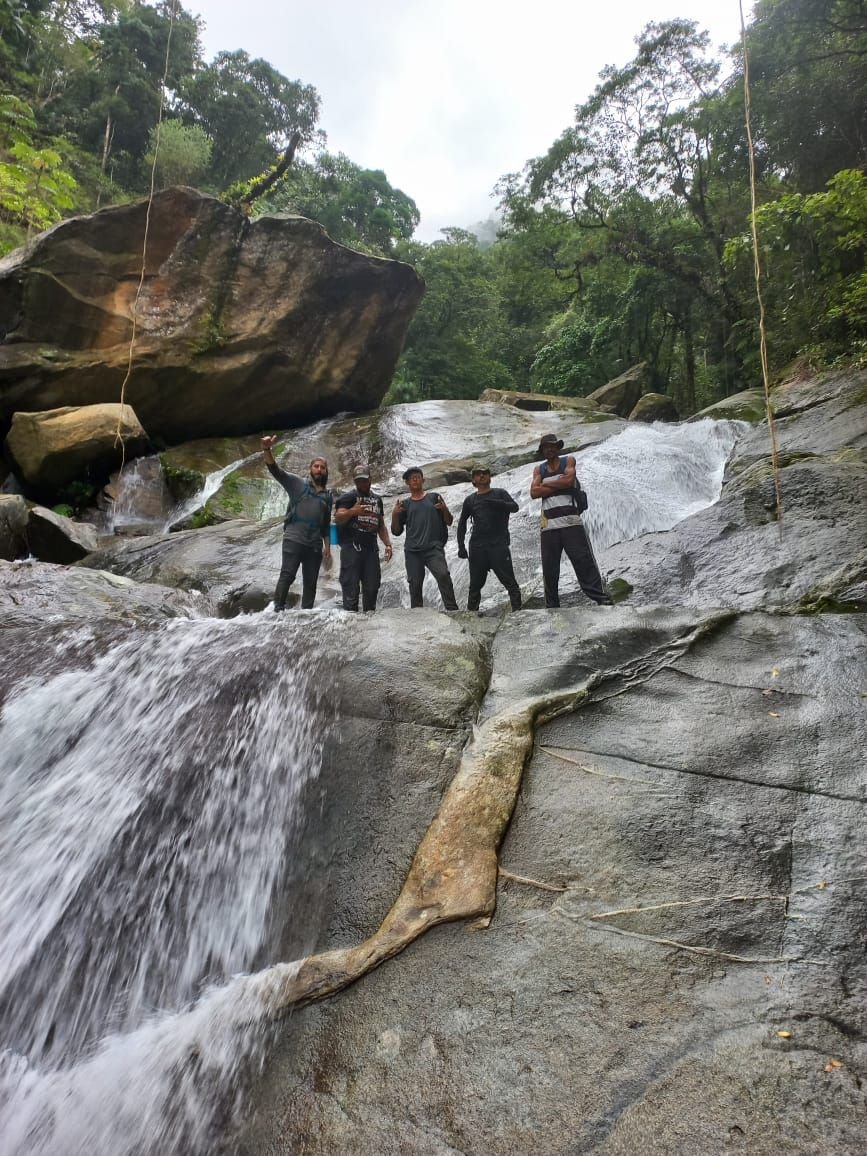 Subímos montanha a cima e nada só se enchergava paredão, a noite por vir e nós ali desorientados pelo gps , escalando na unha , entre raízes e pedra solta passamos por várias rochas e para piorar a chuva começa a descer , paramos em uma rocha para descansar, porque a exaustão já estava nítida, mas o Eric fica com medo da Rocha cair sobre nós kkkkkk. E então saímos a saga de um abrigo mais seguro debaixo de chuva e subindo aquelas benditas pirambeiras até que conseguimos achar outra rocha mais segura e ali pernoitamos , a noite fria e eu o perereca o Cris e o ale tentamos nos aquecer na minha coberta , enquanto o André estava com uma coberta fina aonde se cobriu e só dava para ver os olhos ( parecia estar no Alasca kkk) e o Eric e o Marinho com sacolas de lixo e com o fogareiro aceso , passamos muito frio , além disso ouvíamos barulho na mata e ali por ser uma região aonde se monitora onça ficamos muito apreensivos , mas no final era apenas um sapinho querendo nos assustar .