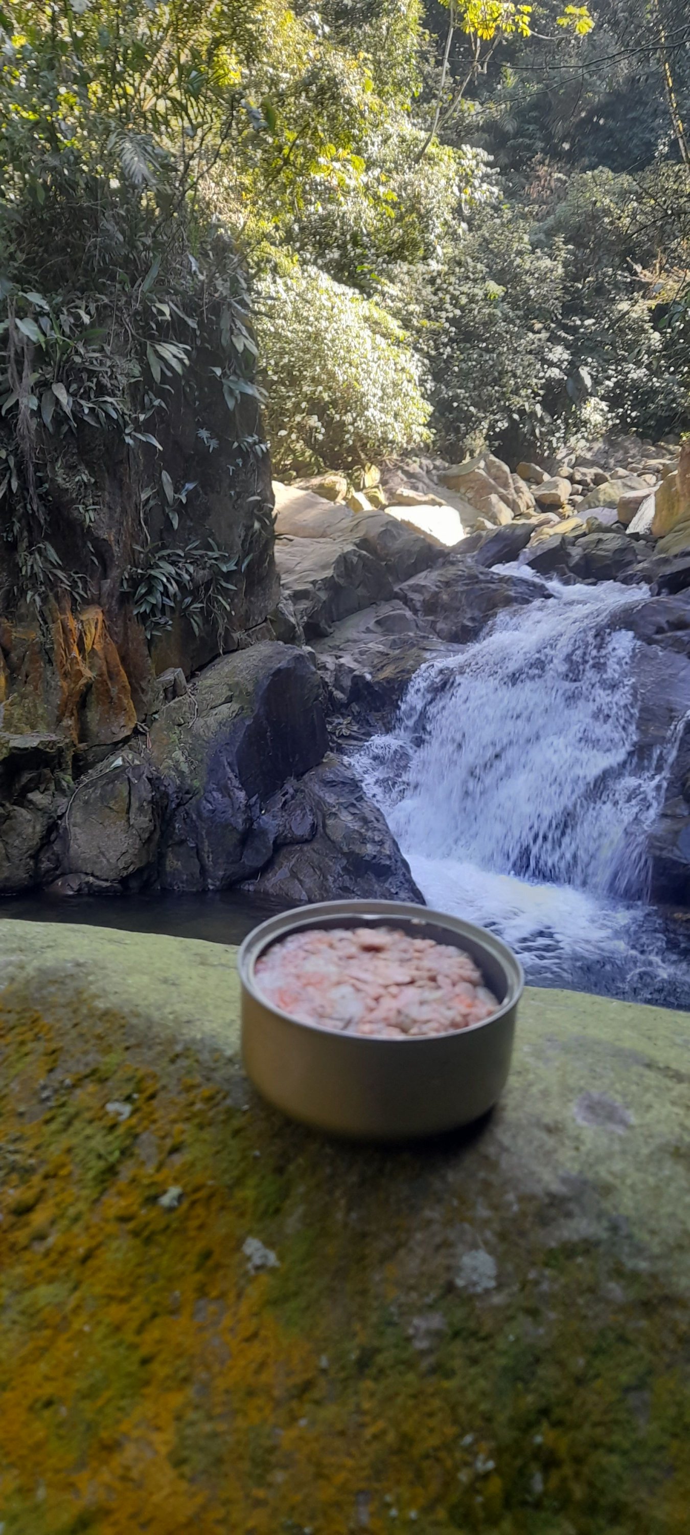 Atravessamos o rio e começamos a andar em uma pirambeira , aonde depois de 30 min percebemos que estávamos andando em círculo, voltamos a margem do rio e avistamos uma corda do outro lado do rio , o ale empolgado disse -" achamos irmão , achamos" , já preocupado preocupado a hora descemos aquela corda em um rappel improvisado e demos de cara com uma linda queda ali paramos e almoçamos, abri meu "PATUM" , e comi como se fosse uma lasanha suculenta, pq a fome tava pegando já.