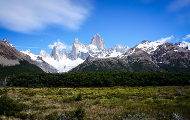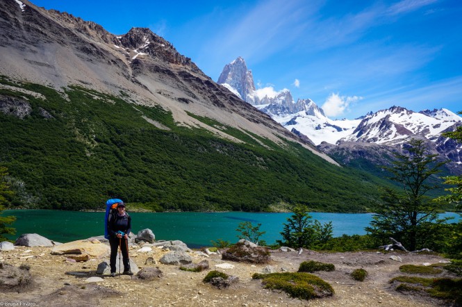 Paisagem cênica. Acho que é assim que defino esse trecho da caminhada. Um lugar com horizonte amplo, cerros enormes que despontam a cada curva e cores que se misturam num quadro perfeito, composto por nada menos do que o icônico Fitz Roy.