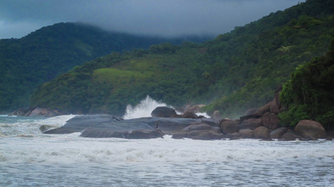 Passamos por Itanema, que é uma praia bem pequena, com camping e quiosque também, e seguimos até Pouso do Cajaíba. De lá nos informamos e descobrimos que a trilha seguia por detrás de uma escola, à direita. Pegamos essa trilha, com várias bifurcações. Em pouco menos de 1 hora já estávamos no ponto mais alto e depois foi só descida. A chuva começou a cair.