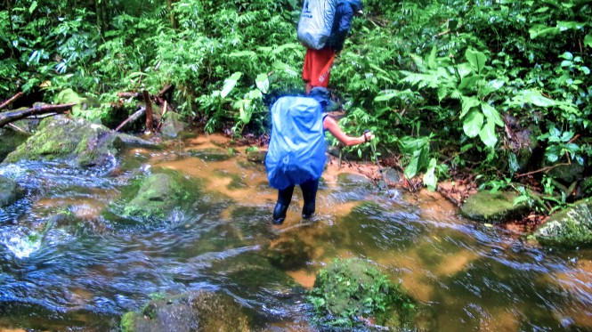 Logo após o almoço seguimos em frente. Depois de 5 minutos de caminhada tivemos que passar por um pequeno rio que estava bastante cheio. Demos as mãos, os bastões de caminhada e conseguimos passar.