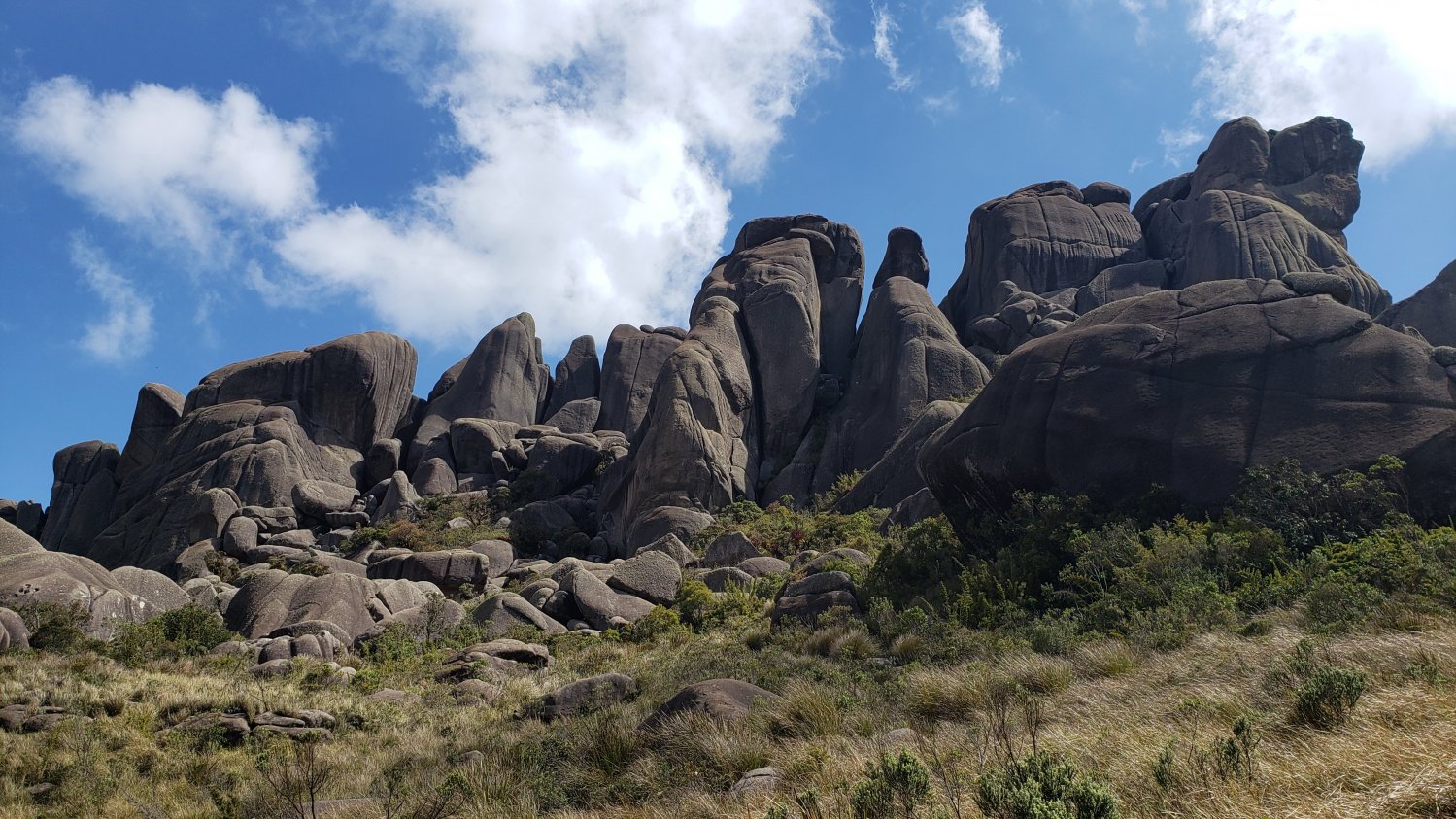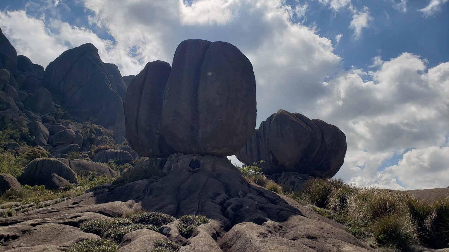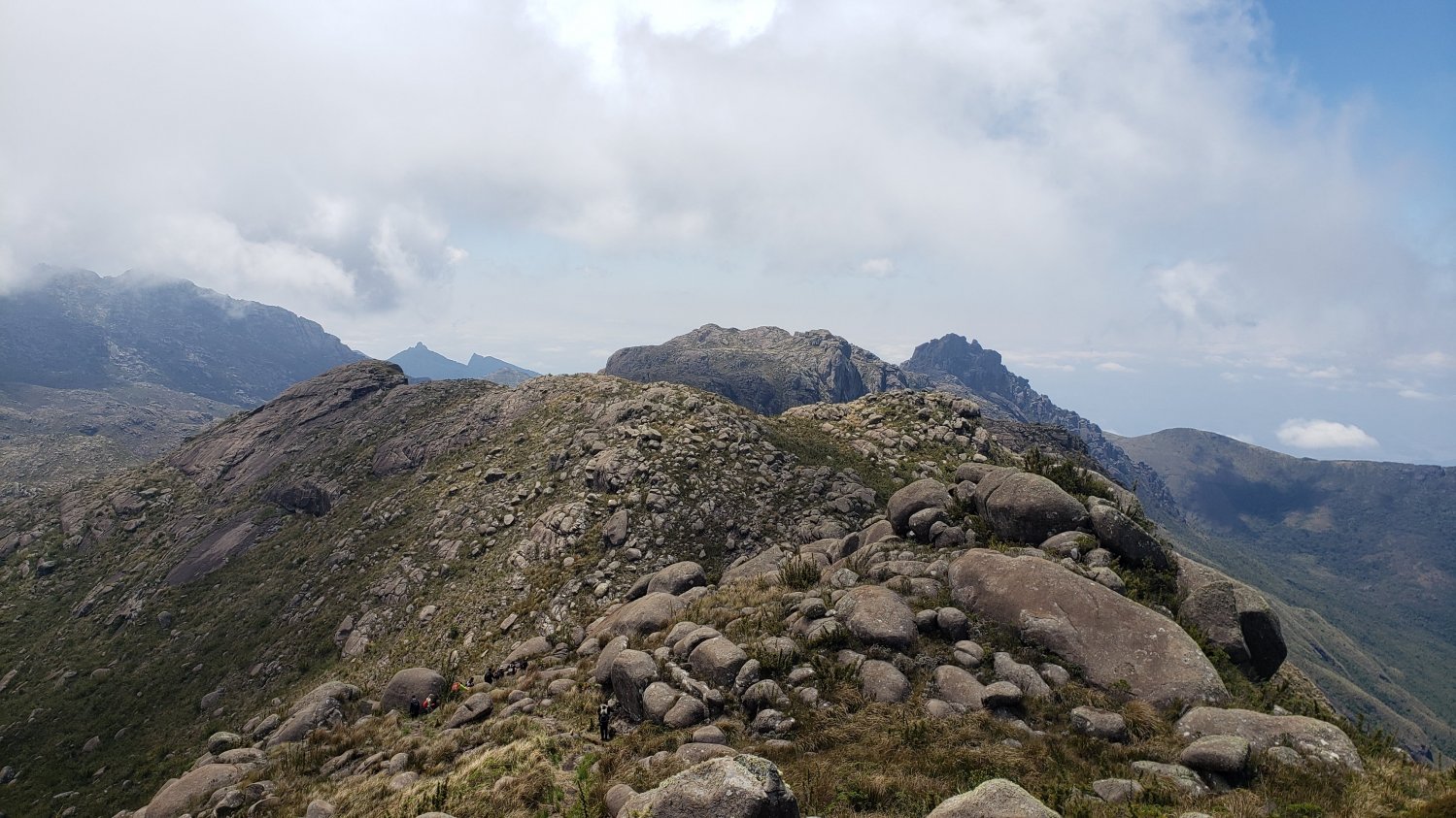 Aqui apareceu um trecho um pouco mais técnico. Uma sequência de blocos rochosos empilhados num vão da rocha principal. É preciso ter cuidado, planejar bem o ângulo da passada de pé, achar uma boa puxada de mão e subir. Montanhistas iniciantes terão uma ótima experiência do que poderão enfrentar em muitas outras trilhas de rochas de granito do Brasil. Acerta a pegada, confia na aderência, impulso e vai... e assim chegamos ao alto do Morro do Couto, primeiro grande objetivo do dia com seus imponentes 2.680m de altitude a uma impressionante vista de todo o Parque. Por sorte, as nuvens davam rápidos momentos de trégua e víamos um pouco do horizonte.