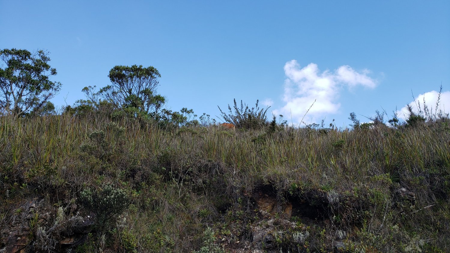 Ao olhar para a esquerda, os campos de altitude que impressionava na paisagem do PNI, à direita, nuvens contrastavam o visual que, rapidamente se abriam e mostravam o vale do Paraíba e as cidades mais baixas da região. De vez em quando, aparecia a Serra Fina. Continuamos andando até que, já com aproximadamente 2.620 metros de altitude, chegamos no alto de um mirante onde estão instalados mais algumas outras antenas. Perguntei logo: “é aqui o Couto?”. De cara, a Dani já disse que não e apontou para o ponto mais alto à nossa frente: “ainda tem que subir isso aí”. Bebi um pouco de água e subimos.